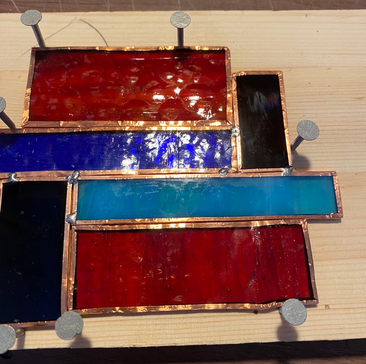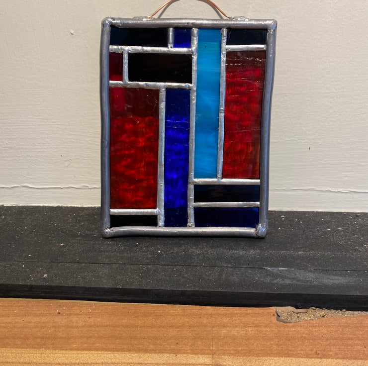 Contemporary glass panel, wall art or sun catcher. Bespoke panel to enhance any home made from different coloured glass with a rounded lead frame. H 145mm W 115mm D 7mm.