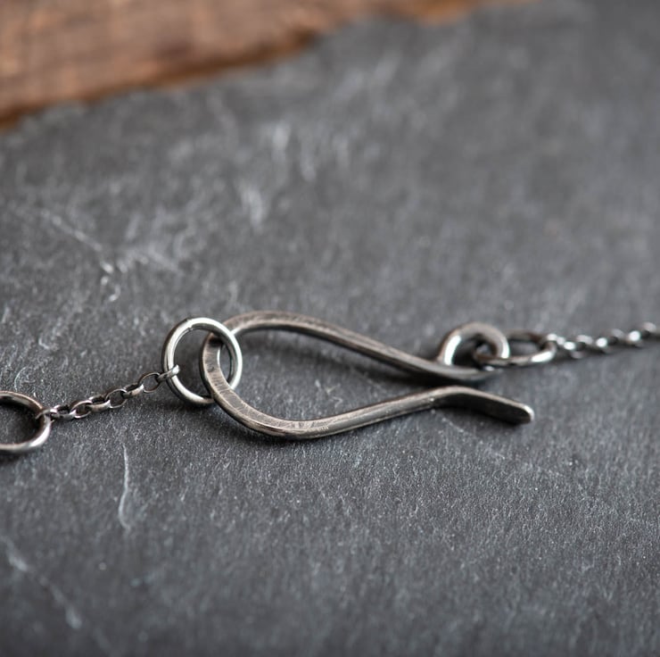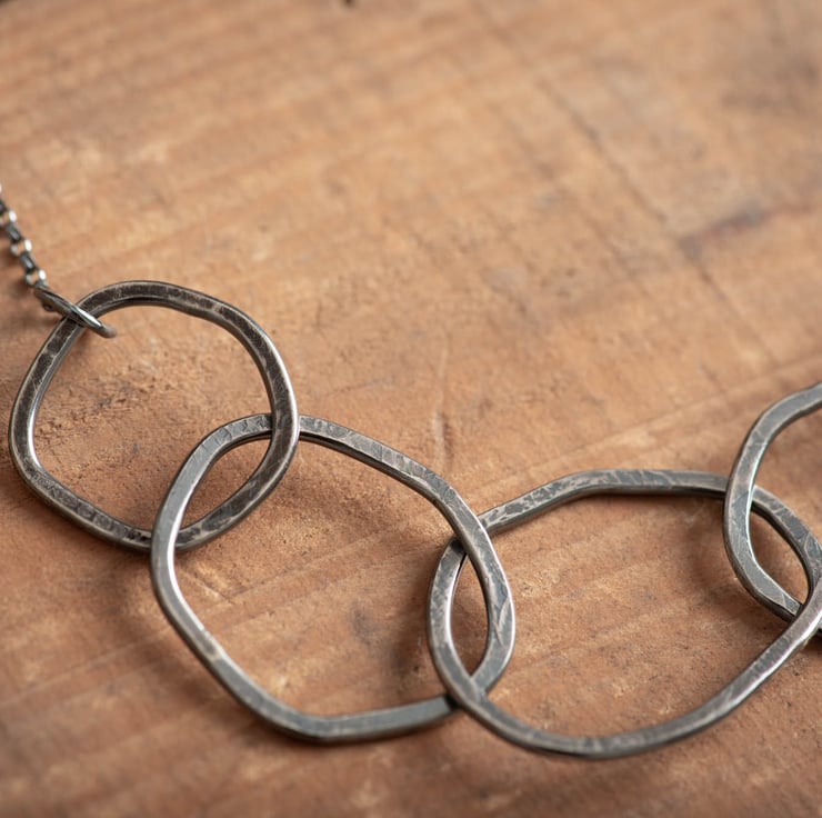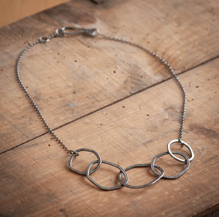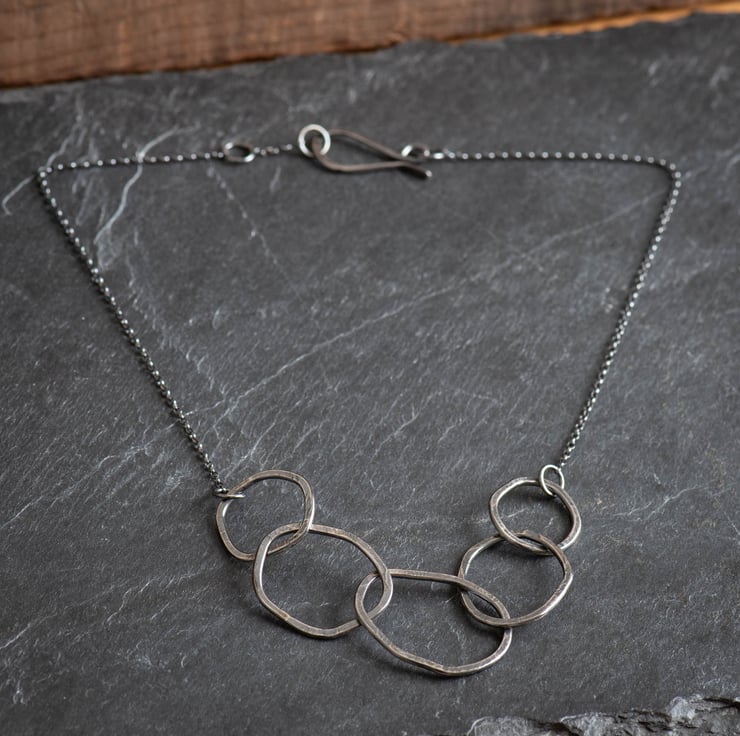 The necklace features 5 organic circle shapes, linked together. I have used an old hammer to texture the shapes, and oxidised the whole necklace to a dark colour, which shows off these lovely textures.