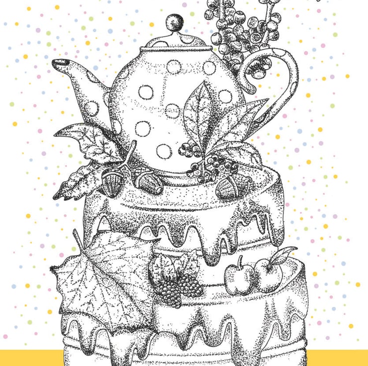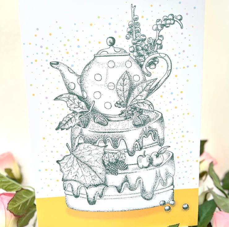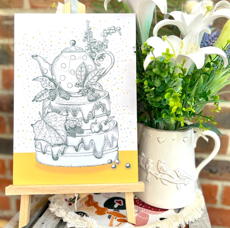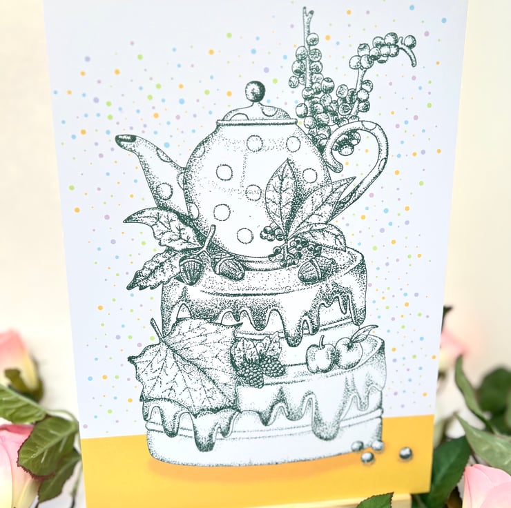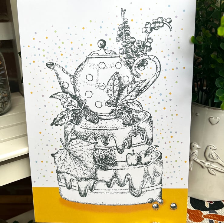 Illustration print - 'Acorn Tea Cake' is a A4 (21 x 29.7cm) colour print of a pen illustration, featuring a teapot surrounded by nature on a cake. I finished this piece off on the computer to add a splash of colour.