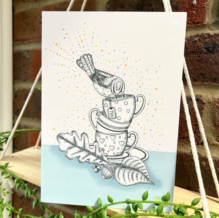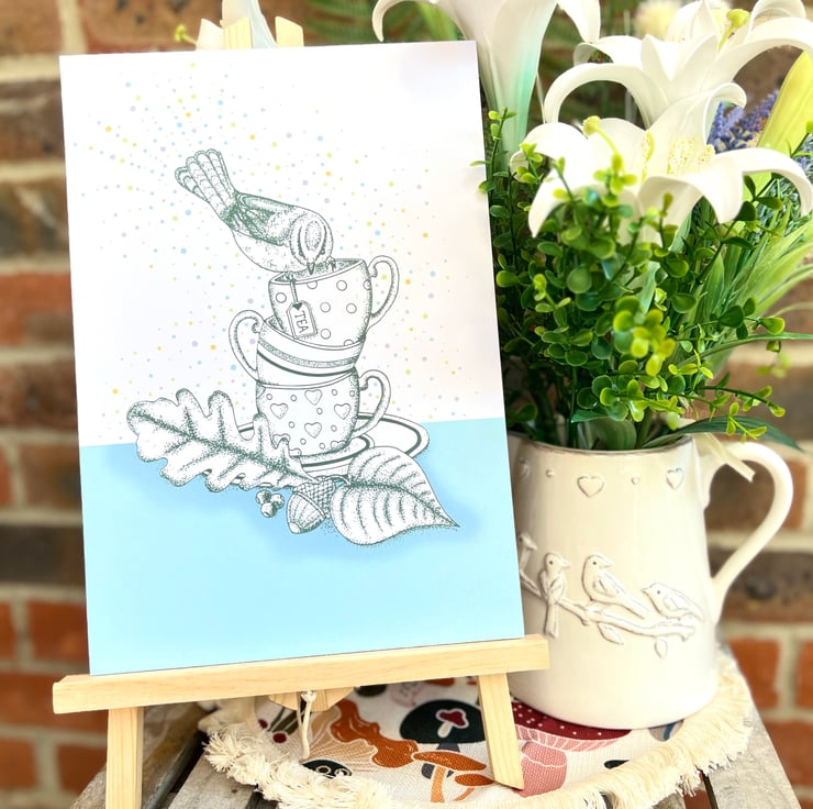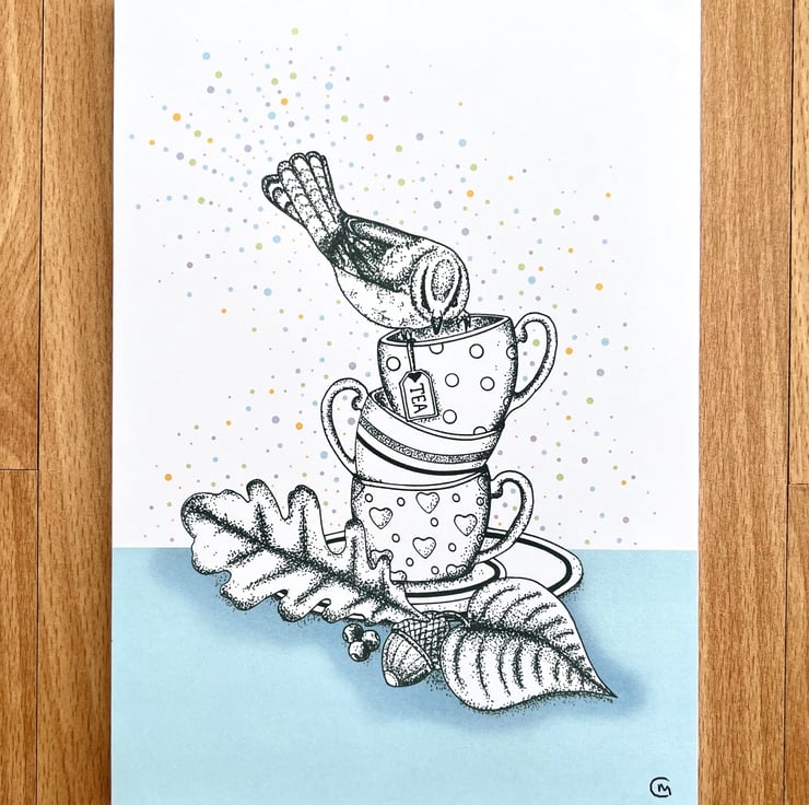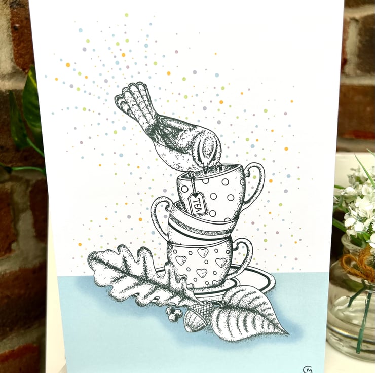 Illustration print - 'Tea Cup Stack' is a A4 (21 x 29.7cm) colour print of a pen illustration, featuring a stack of tea cups with a Blue Tit balancing on the top. I finished this piece off on the computer to add a splash of colour.