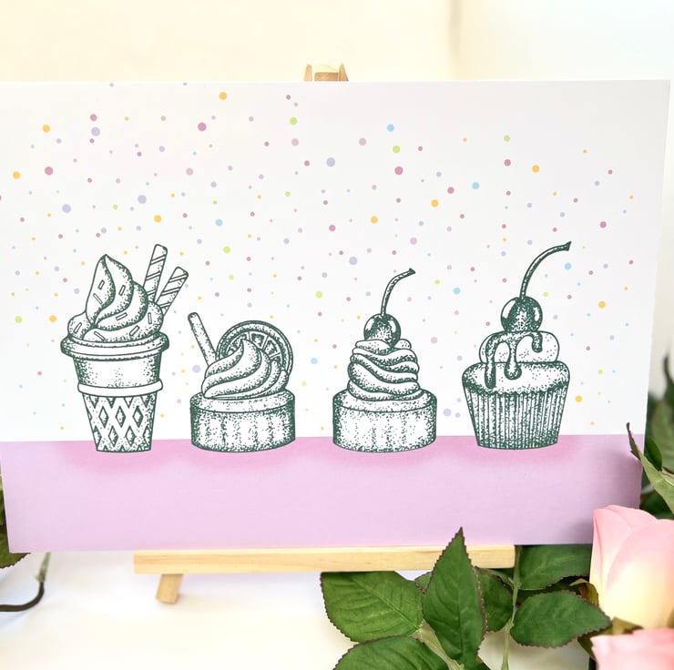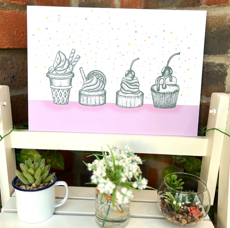 This illustration would look great in your kitchen, conservatory, or summer house. It would also make a lovely gift for any afternoon tea or sweet treat fan.