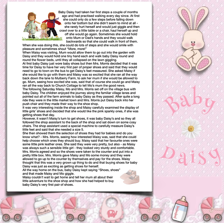 There are other children in Maisy’s class at school - Violet, Billy with his pet rabbit, Amber, Tilly, Rosie and her kittens, Amelia, Ruby, Marigold, Bobby with Max the dog, and the twins Oliver and Olivia, who have a puppy called Oscar. The dolls are all 26cm tall and baby Daisy is 16cm. Maisy and Mo love nothing more than having adventures with their friends. You can read about their adventures on my Facebook and Instagram pages - Maisy Muffin Rag Dolls and on my Mulberry Green Pinterest boards.