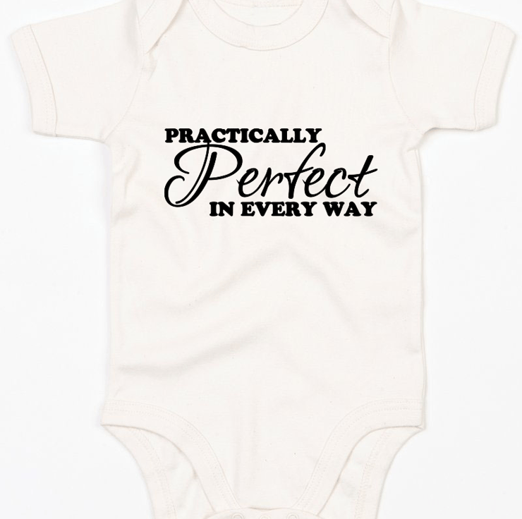 Soft cotton baby grow printed with the words "Practically Perfect in everyway" Mary Poppins phrase.