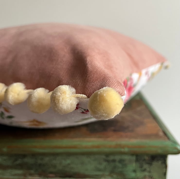 The back of the cushion is blush pink needlecord taken from a soft sample swatch discarded by the fashion industry. The cushion cover is finished with velvety cream pompoms down the sides.