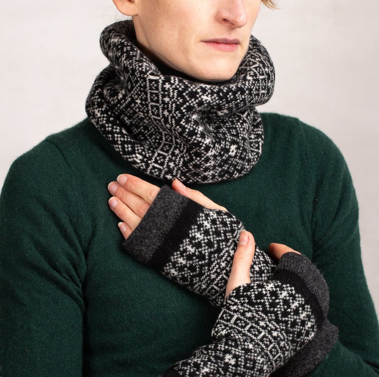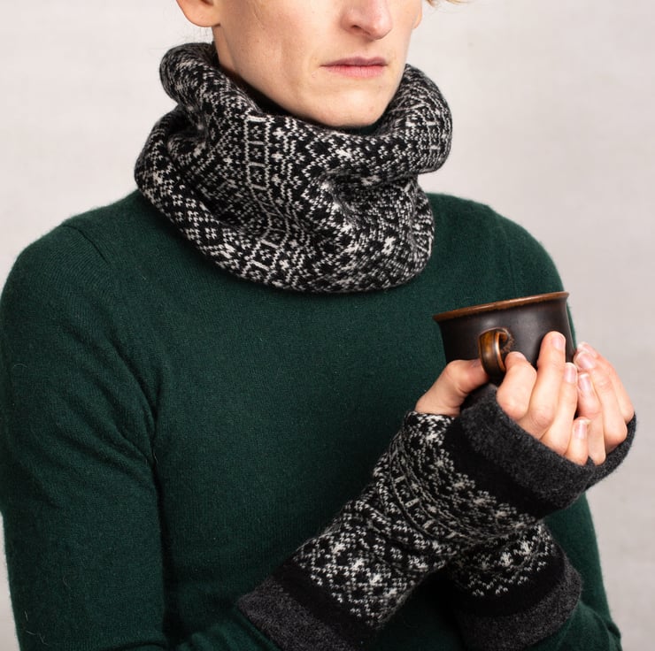 Perfect comforting item for your loved one. Classic monochrome Fair Isle snood.