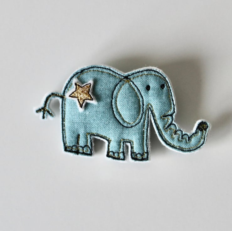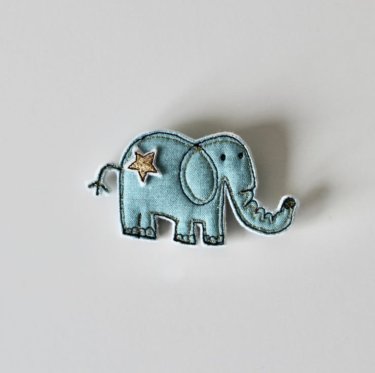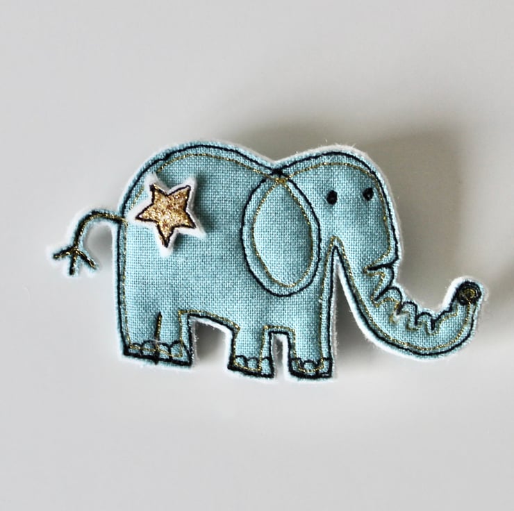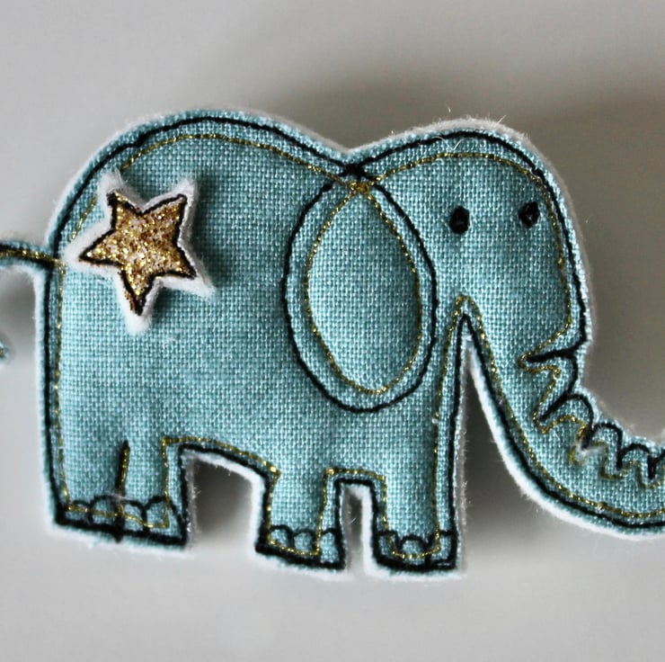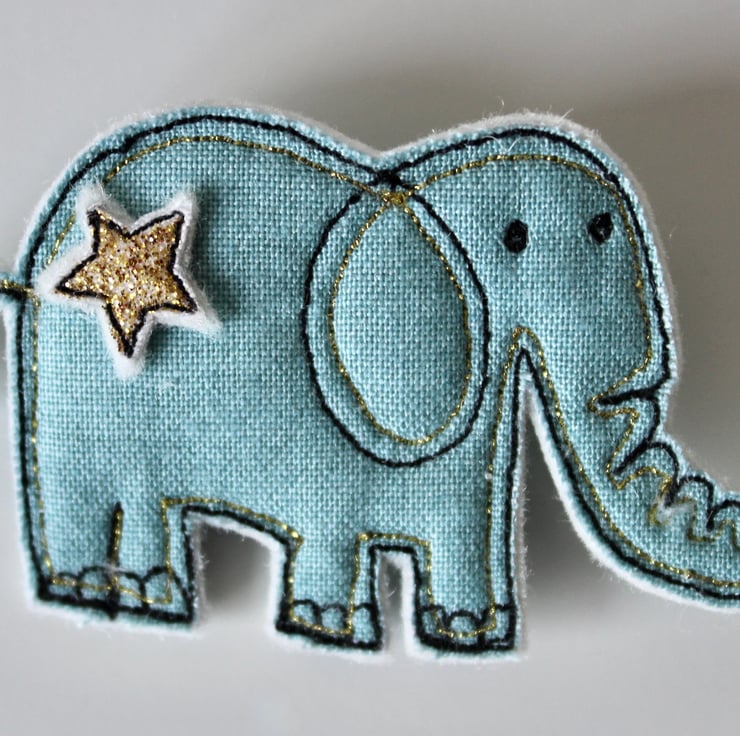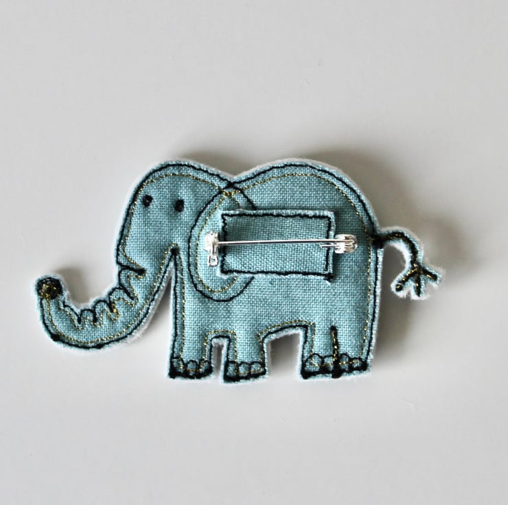 Elephants are sewn using cotton cloth, metallic cloth, 100% wool felt and free hand machine embroidery; multiple layers of cloth are sewn together and cut out by hand using sharp scissors. The pins on the back are attached with hot glue, with a sewn fabric rectangle to secure.