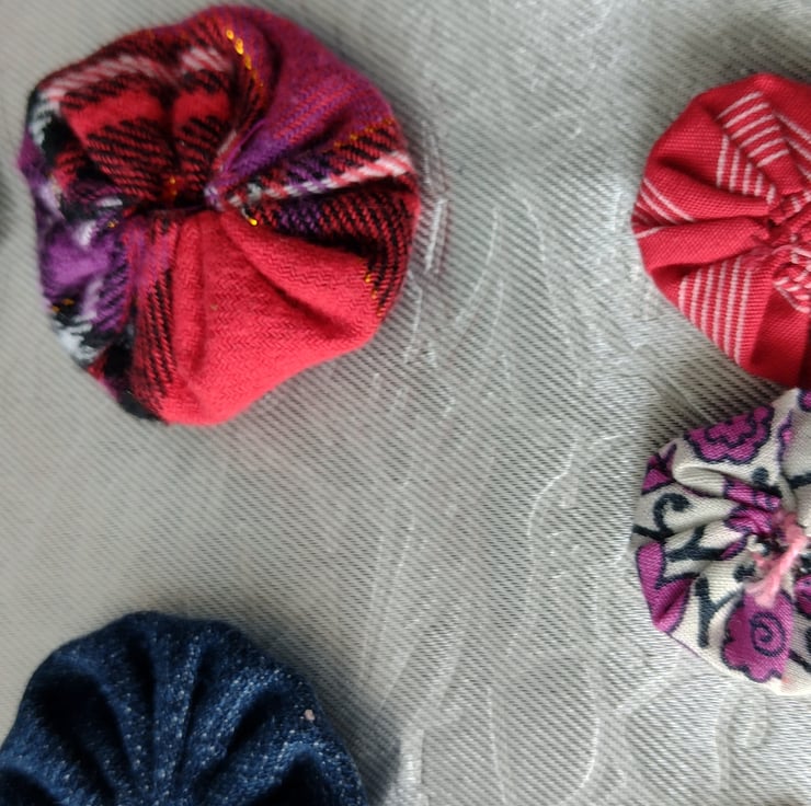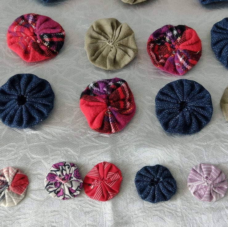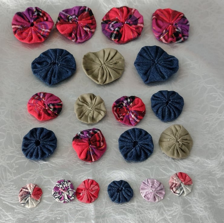 A large pack of cute Suffolk puffs or Yoyo's as they're also known. A mix of denim and check colours in mixed sizes.
