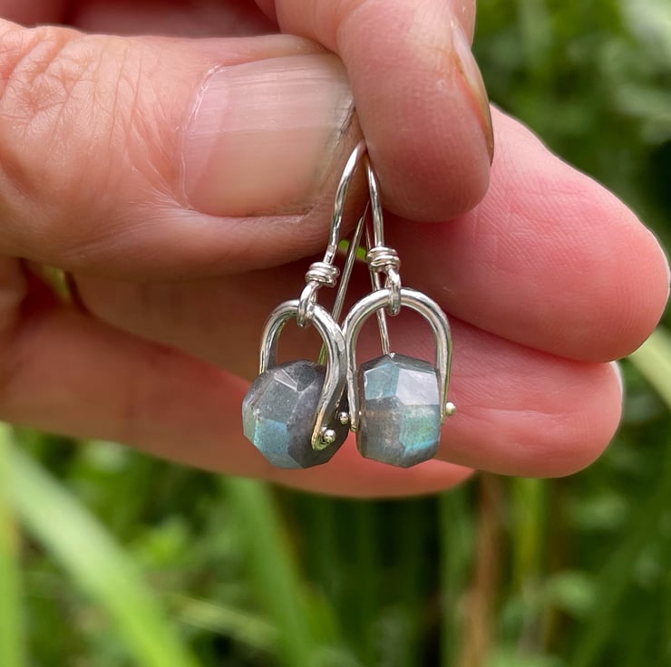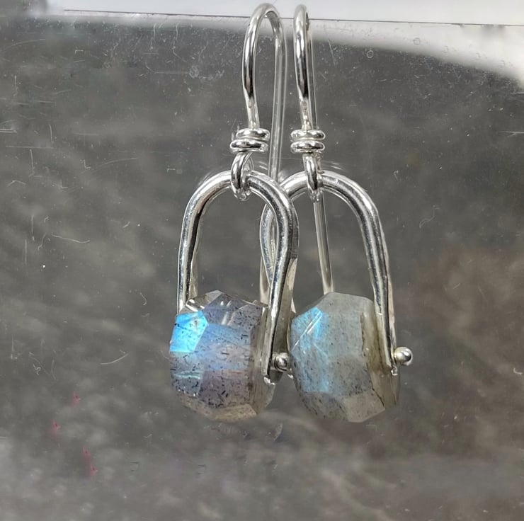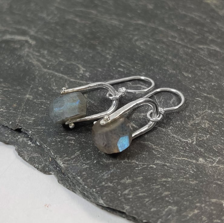 Sterling silver and faceted labradorite small dangly castor like earrings on handmade hooks.