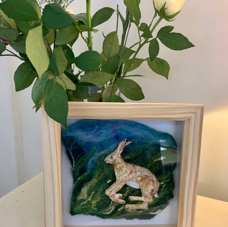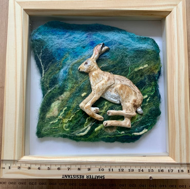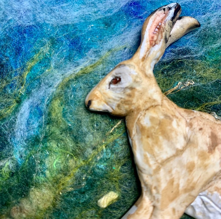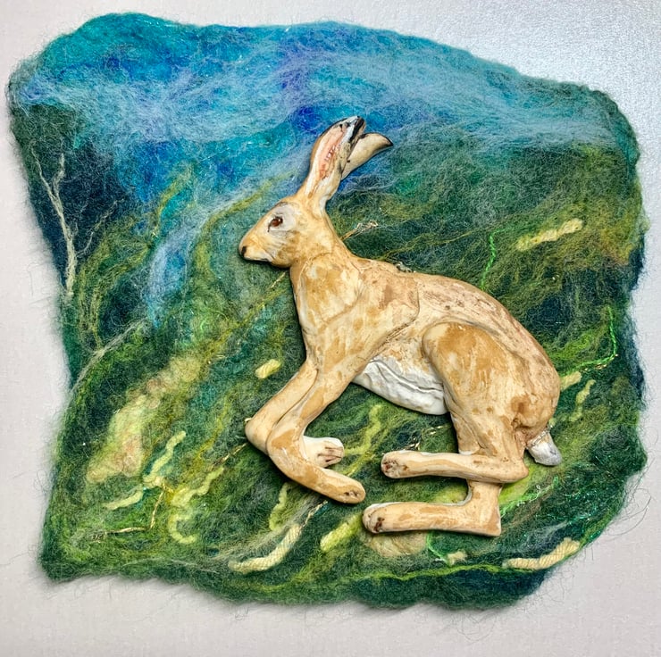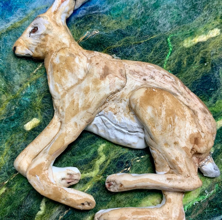 The hare is hand sculpted and painted polymer clay and stitched onto the background.