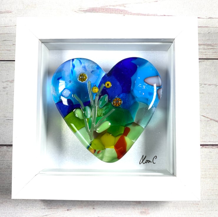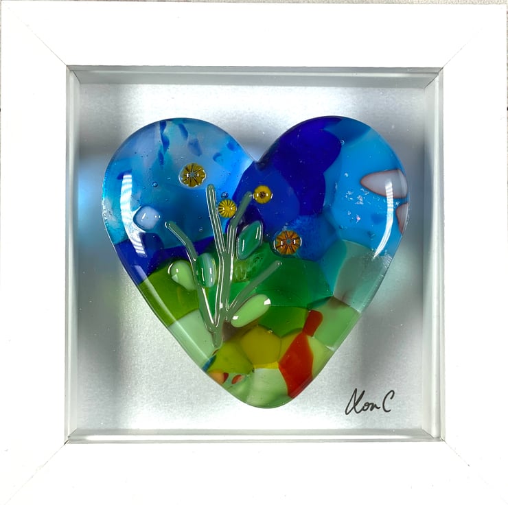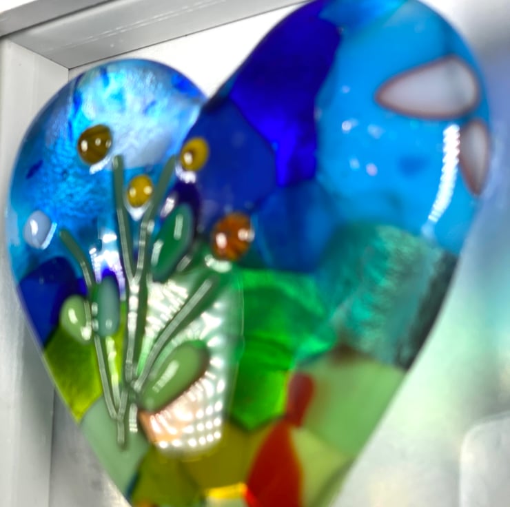 Beautiful and individual glass heart made using recycled art glass which is encased in the lovely heart shape . One the kiln has worked it’s magic it then goes back in for a second firing to add the tiny murrine flowers . This is a beautiful example of one of my cast hearts . Frame is 12 cm square and can be hung on the wall or be free standing . Perfect fused hlass gift .