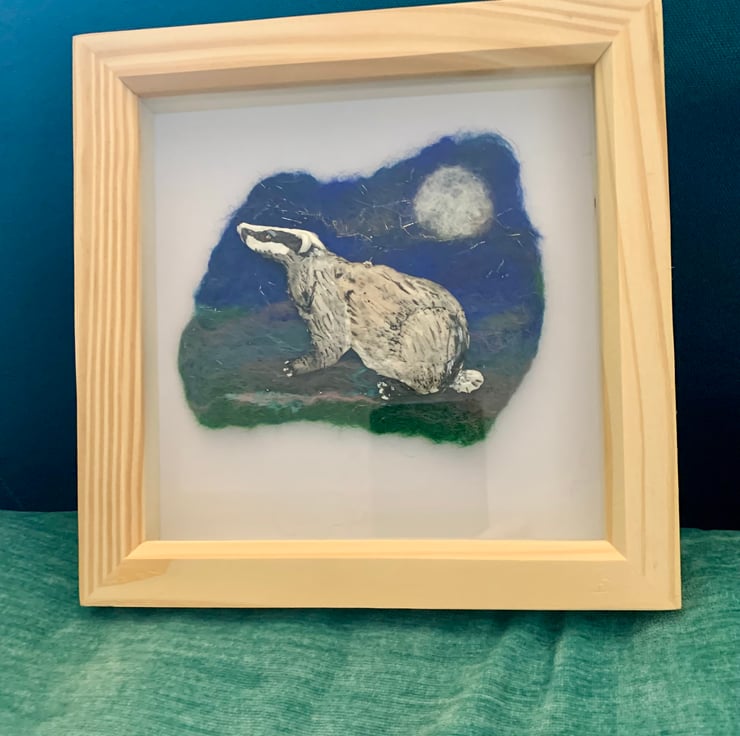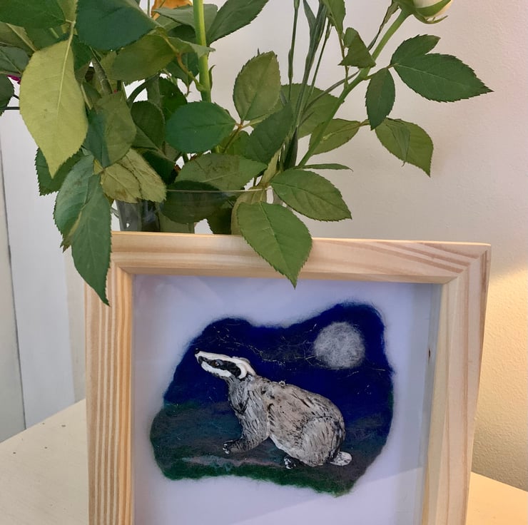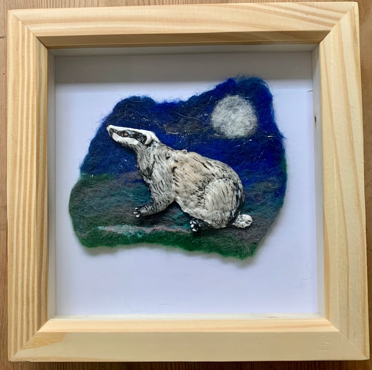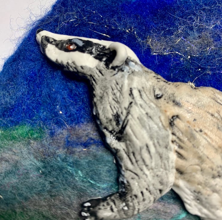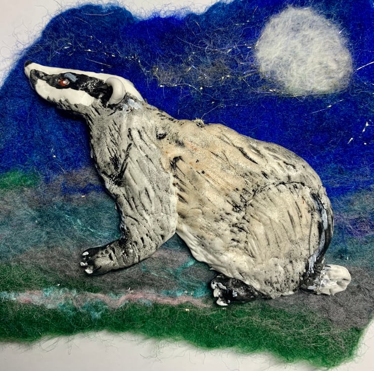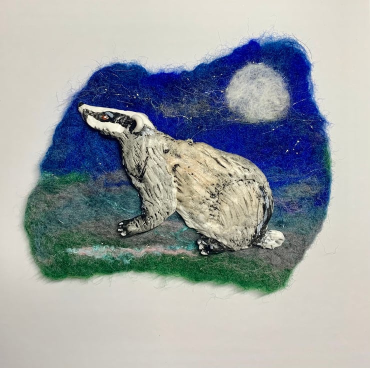 A badger sits under a moonlit sky. The badger is hand sculpted and painted polymer clay, stitched onto a felted landscape.