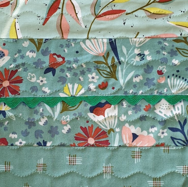 Made from 100% cotton fabric in shades of green and spice, a layer of cotton wadding and lined with striped cotton. It is quilted using 100% cotton thread in a matching mint green colour.