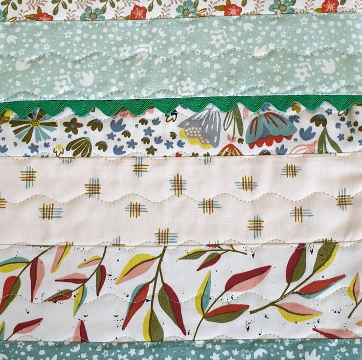 Made from 100% cotton fabric in shades of vanilla, green and coral, a layer of cotton wadding and lined with striped cotton. It is quilted using 100% cotton thread in a matching mint green colour.