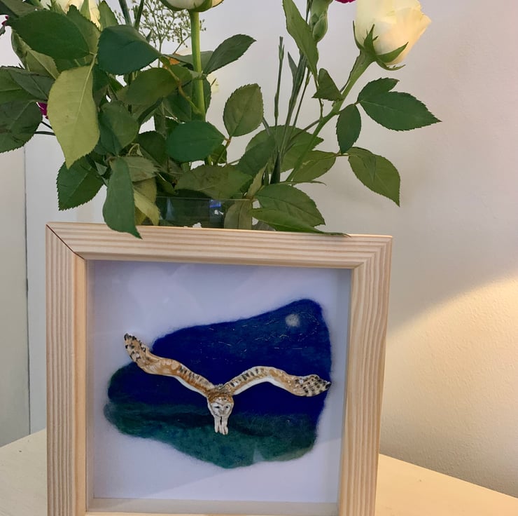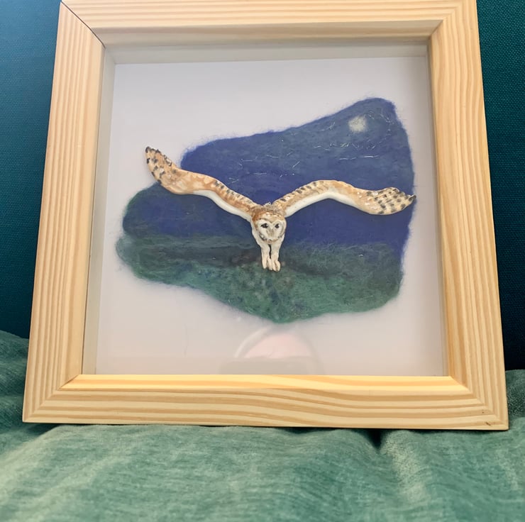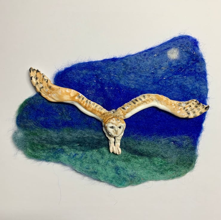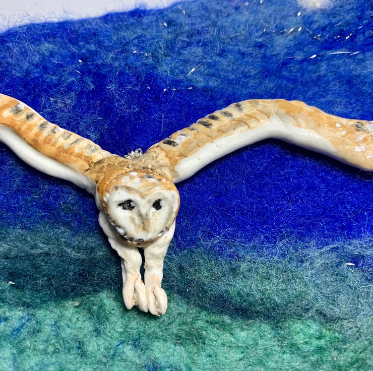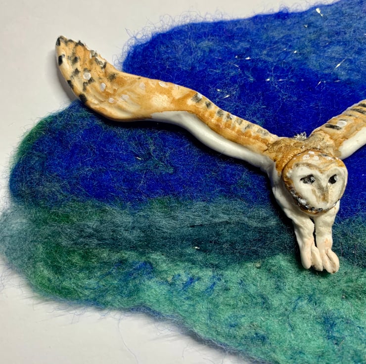 The owl is hand sculpted and painted polymer clay and sewn onto the background scene.