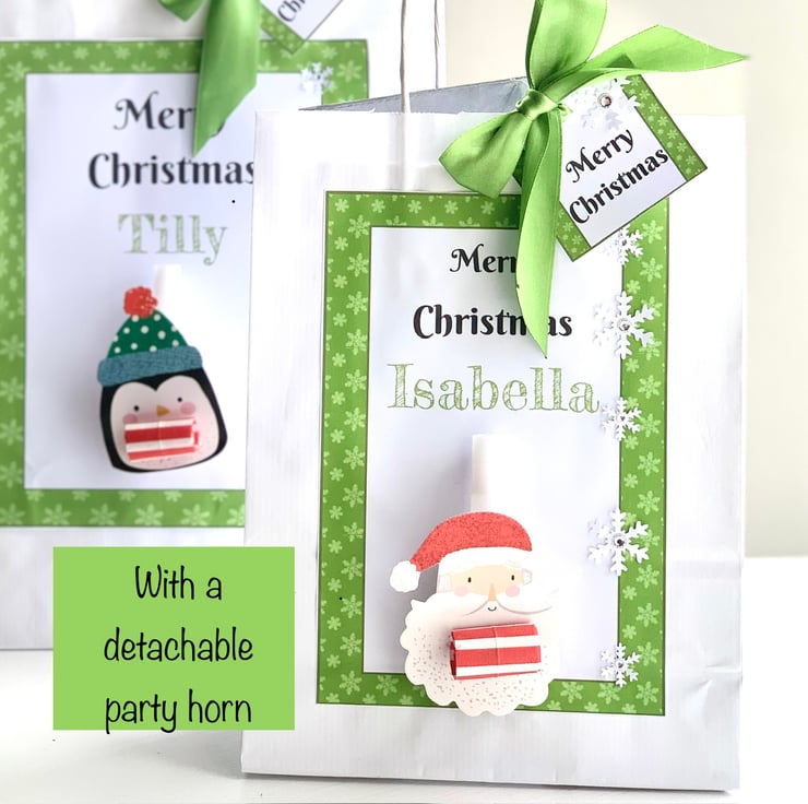 - You will receive x1 personalised gift bag with attached party horn, x1 ribbon tied tag and a sheet of silver or gold coloured tissue paper