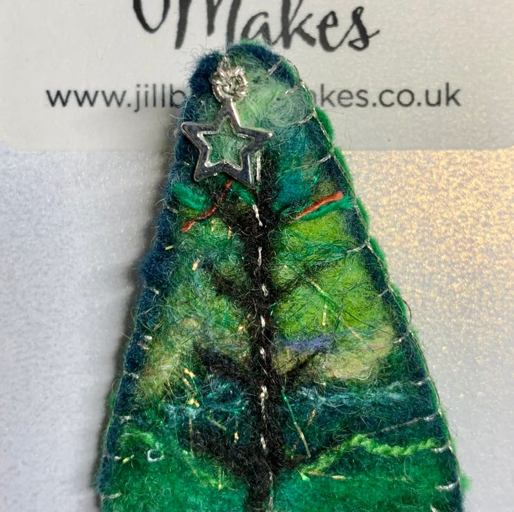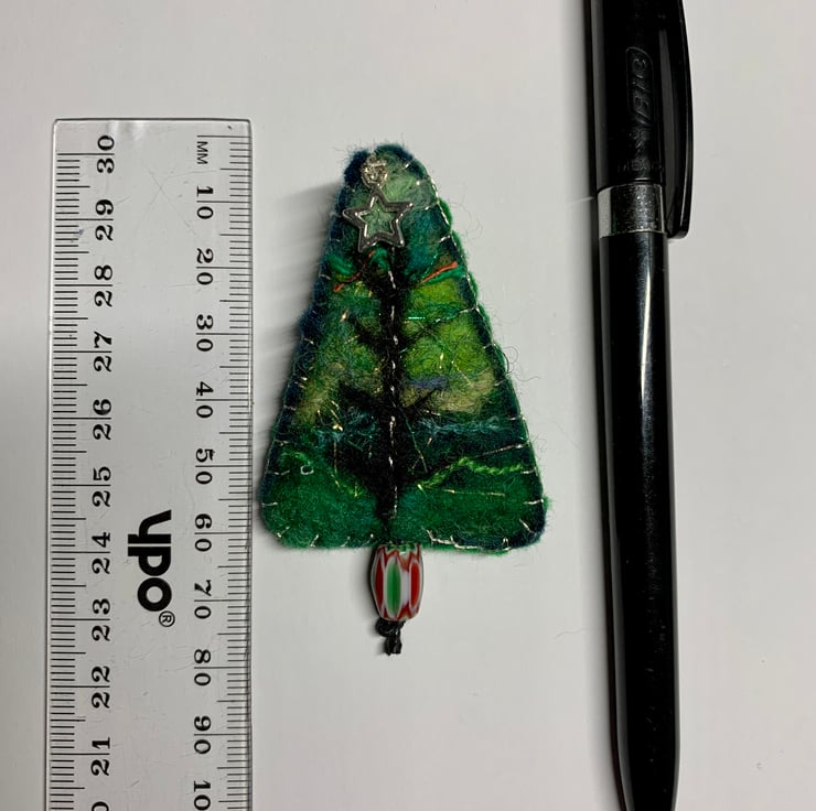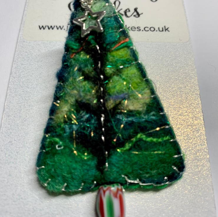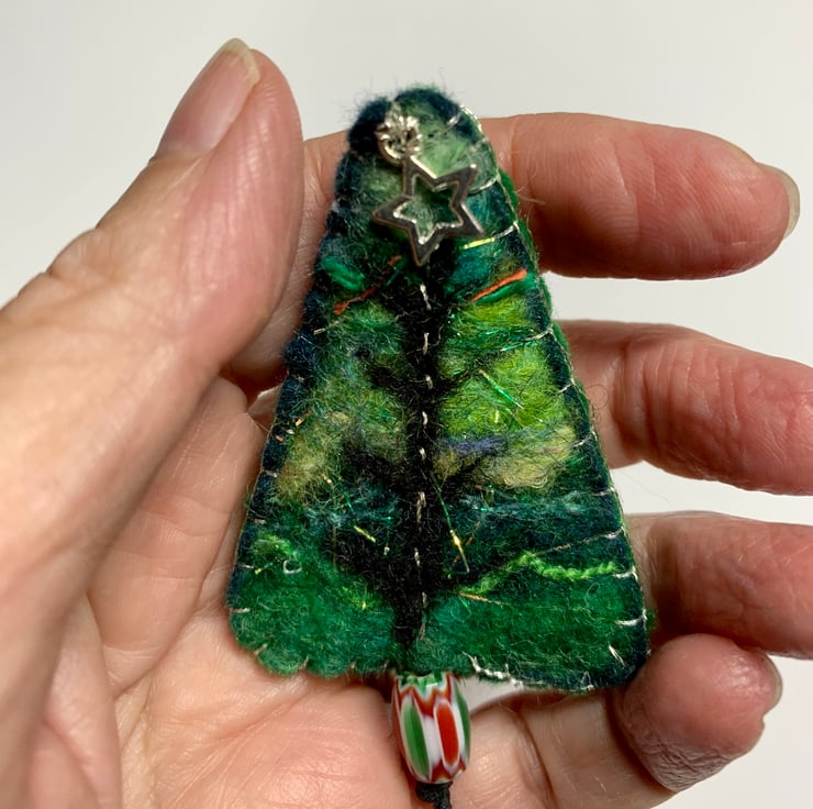 A hand felted and embroidered Christmas tree brooch with a little silver star and pretty bead pot.
