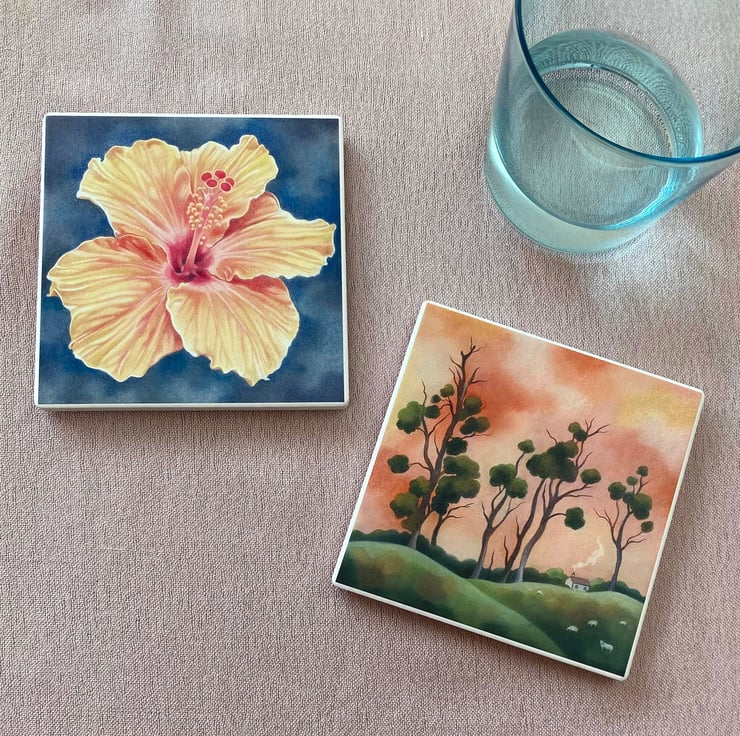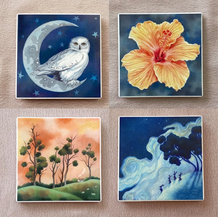 It works beautifully with any of my other coasters: 'Midnight Owl', 'Orange Hibiscus' or 'Moonlit Rabbits' or as a stand alone piece.