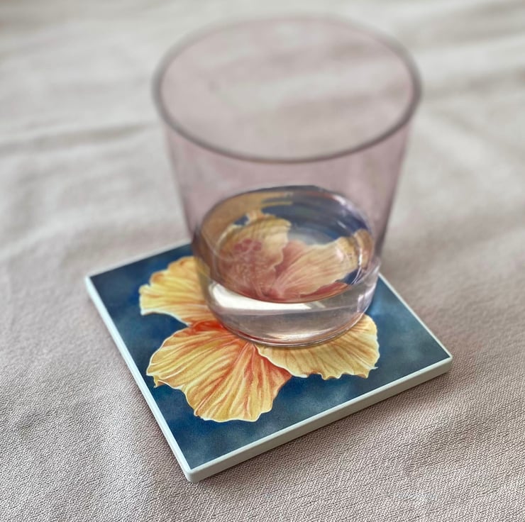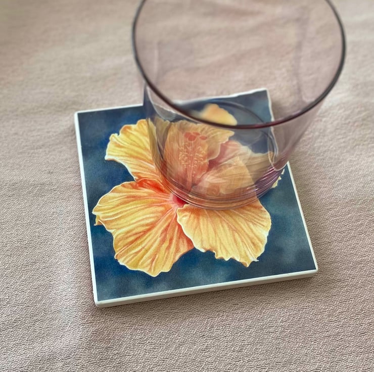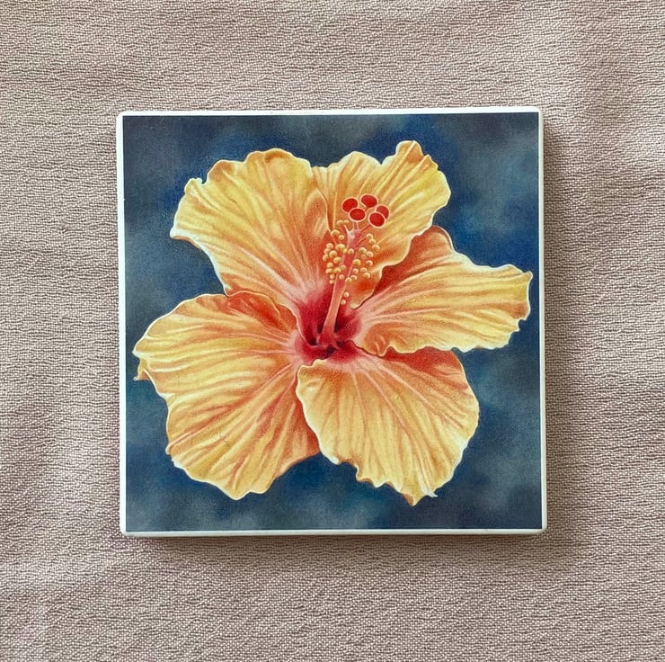 This striking ceramic coaster has a lovely, smooth sandstone finish, with a cork back (please see last picture). It shows off my 'Orange Hibiscus' tropical flower illustration beautifully. I created the original artwork using a combination of chalk pastels and pencils.