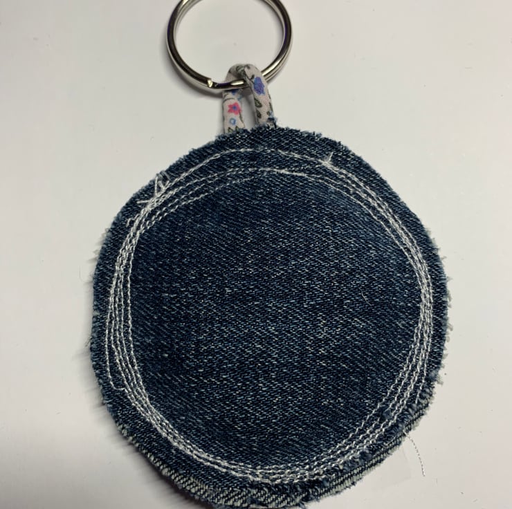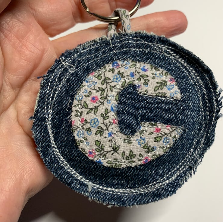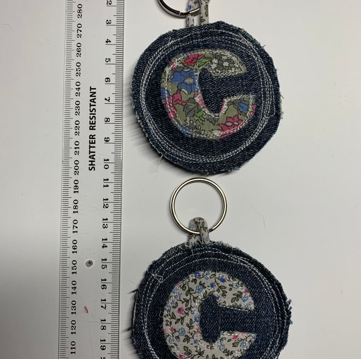 Handmade key ring, stitched from up-cycled denim and ditsy cotton fabric. Letter C Made with love.