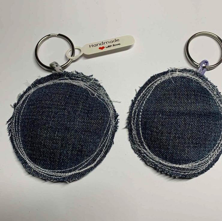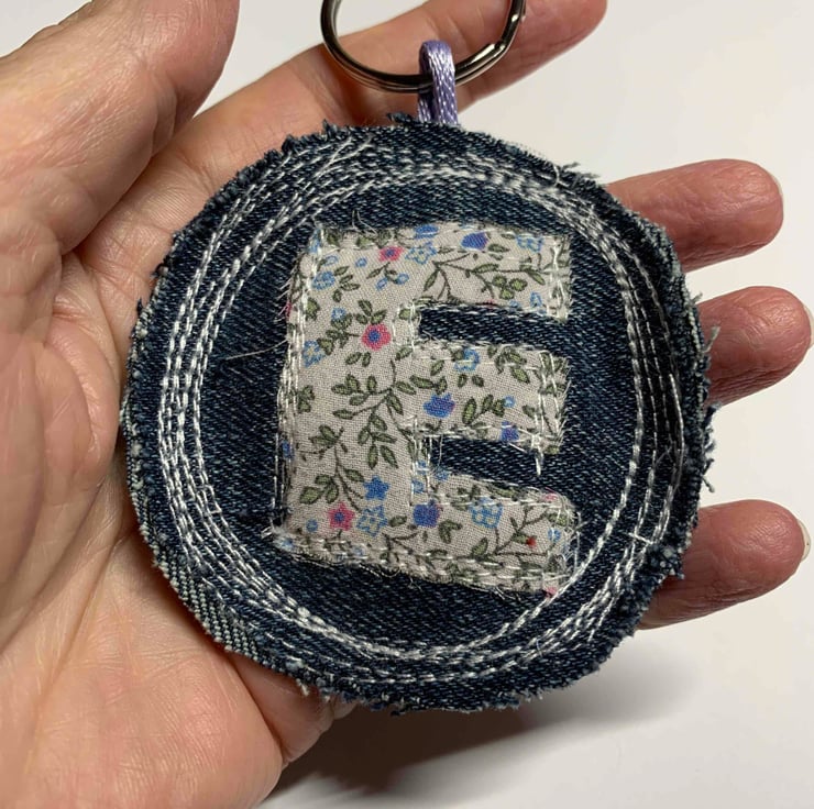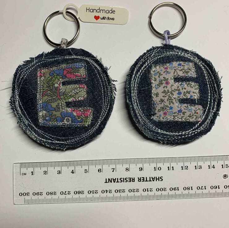 Handmade key ring, stitched from up-cycled denim and ditsy cotton fabric. Letter E. Made with love.