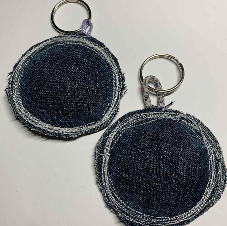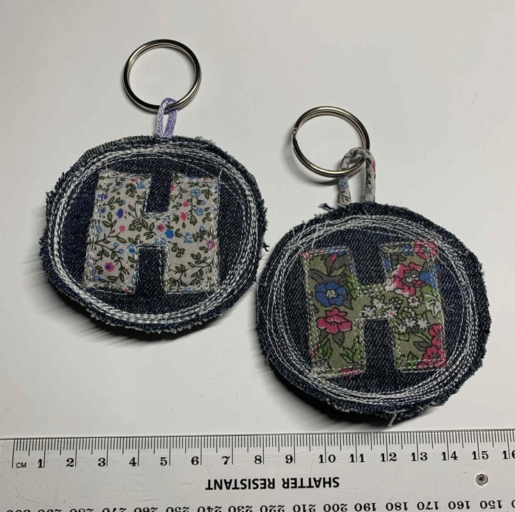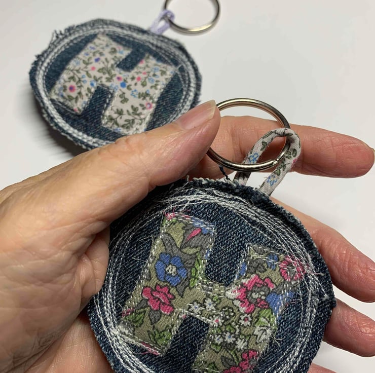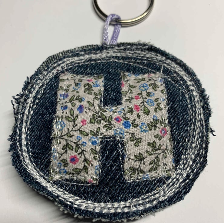 Handmade key ring, stitched from up-cycled denim and ditsy cotton fabric. Letter H. Made with love.