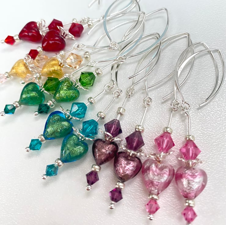 Even at my age, I am a hopeless romantic, full of Hearts & flowers - like these sweet heart and silver earrings. On solid silver sterling silver, they are very wearable and gentle on sensitive skin. The little hearts are gorgeous amethyst purple Venetian Murano glass - if you want another colour - just mail me & I will check the glass drawer.