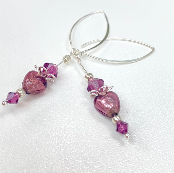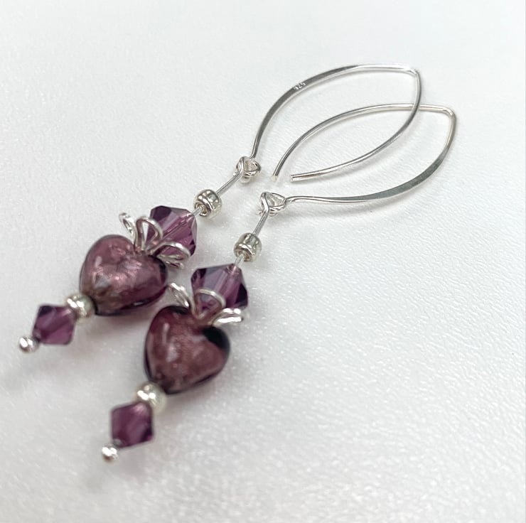 Beautiful quality solid Eco Silver Amethyst Heart long drop Statement Earrings made from Venetian Murano Glass & Swarovski Elements Crystal
