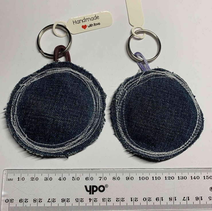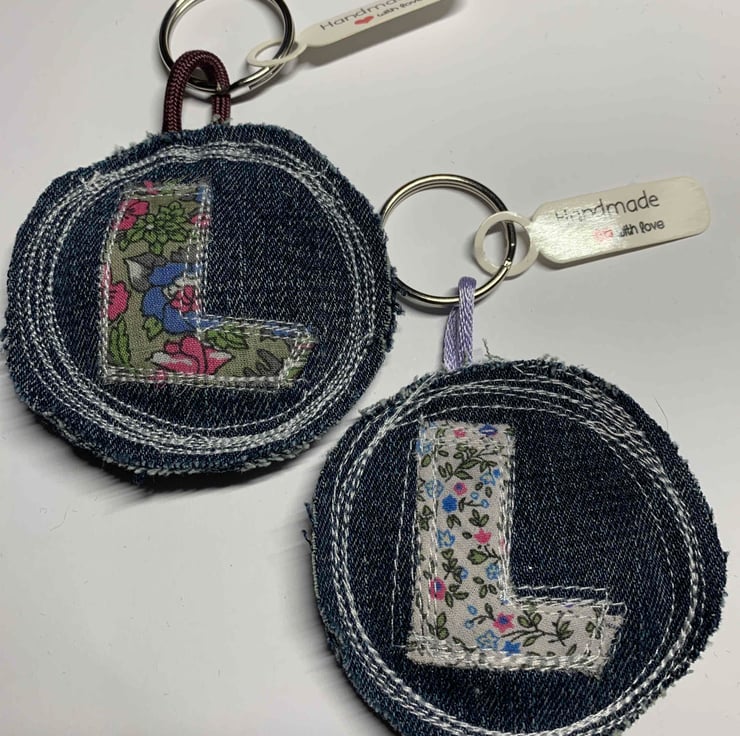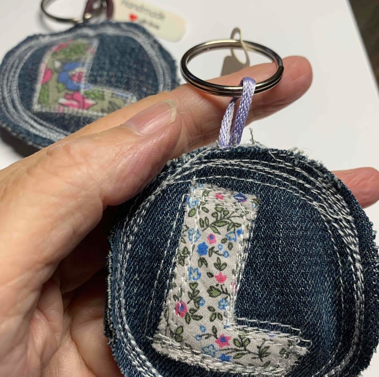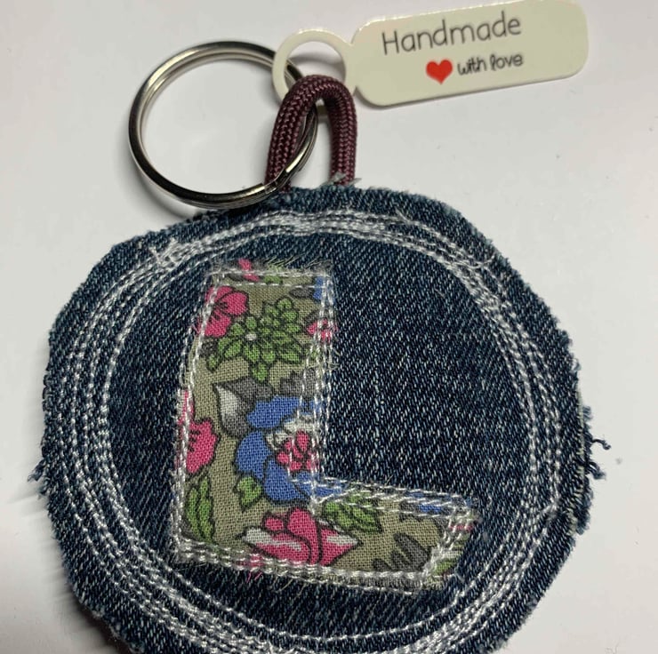 Handmade key ring, stitched from up-cycled denim and ditsy cotton fabric. Letter L. Made with love.