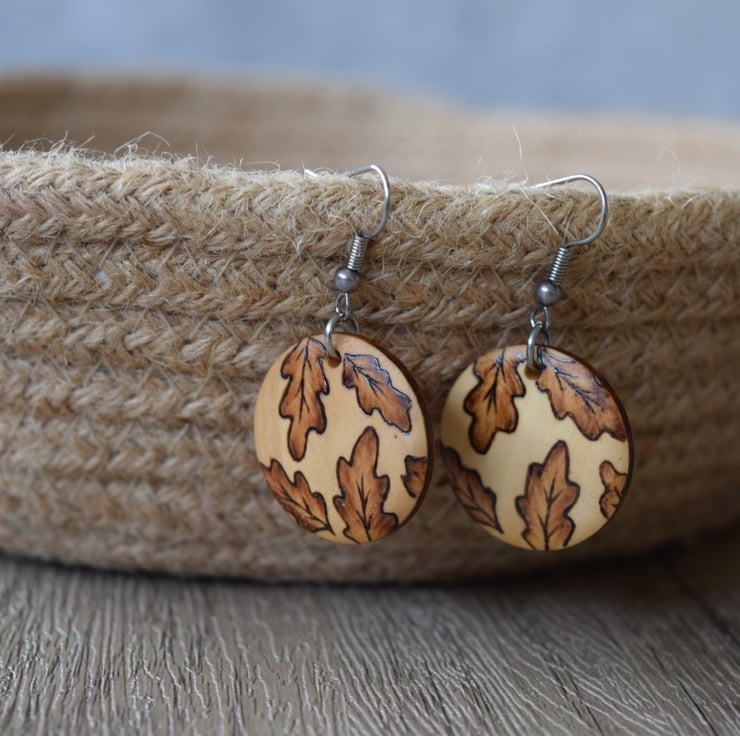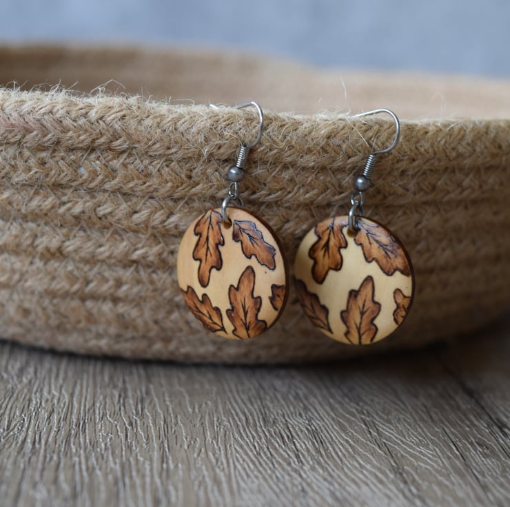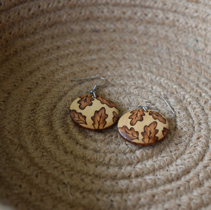 Small wooden, lightweight, casual wear earrings with a hand burnt pyrography Oak leaves design.