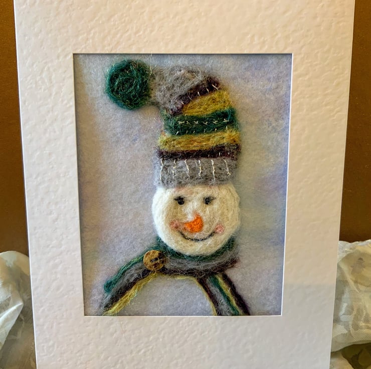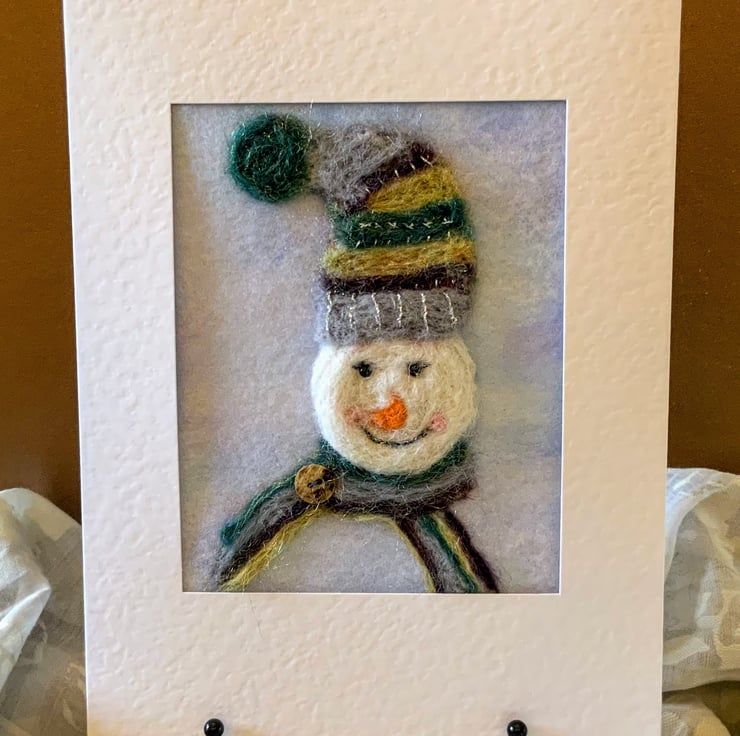 Needle felted snowman in wooly hat and scarf. This charming snowman has a pom pom on his hat and a charming little wood button on the his scarf. A jolly fellow with a carrot nose and a sweet smile. Hand made with pure merino wool and silk threads. Using a needle felting technique and free flow embroidery.