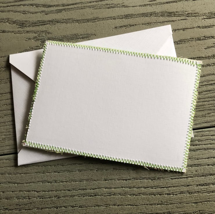 A piece of white card is machine stitched to the back of the postcard for your message.