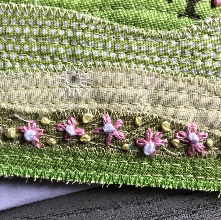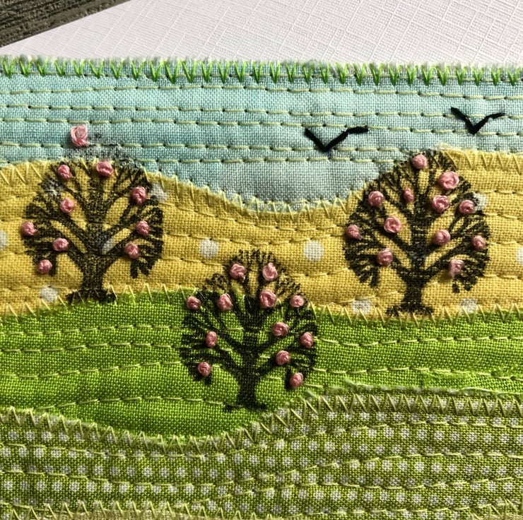 This delightful spring themed postcard is created from blue, yellow and green fabric scraps sewn onto a calico and fleece interfacing backing to give a quilted effect. The trees are stamped in a black ink and I have embroidered the pink blossom in colonial knots using embroidery thread. The flowers are created using daisy stitch in the same pink with white colonial knots for the centres. The birds are hand stitched in black embroidery thread.