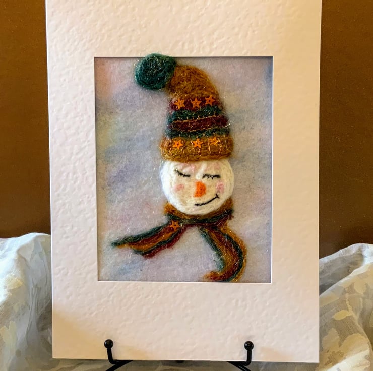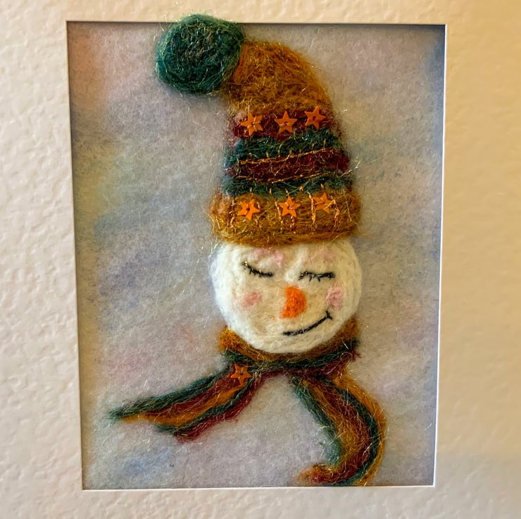 Needle felted snowman in wooly hat and scarf.Made from merino wool and free flow embroidery using silk threads with little star embellishments.