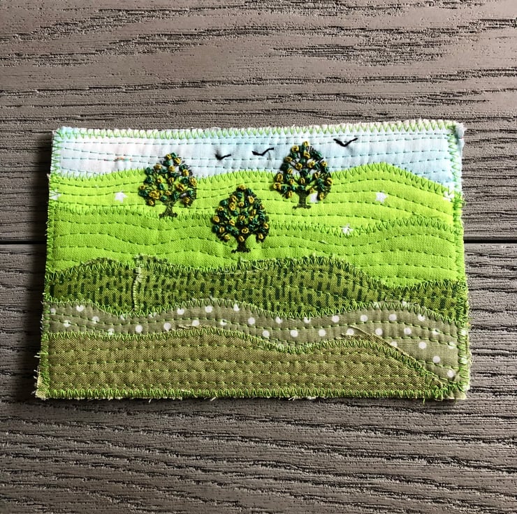 This summer themed postcard is created from scraps of fabric in blue, green and white sewn onto a calico and fleece interfacing to give a quilted effect. The birds are hand stitched in black embroidery thread and the trees have been printed in a black ink and the leaves embroidered in three shades of green embroidery thread using a colonial knot stitch.