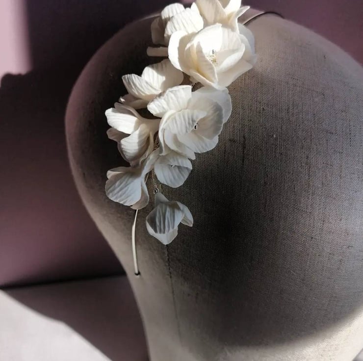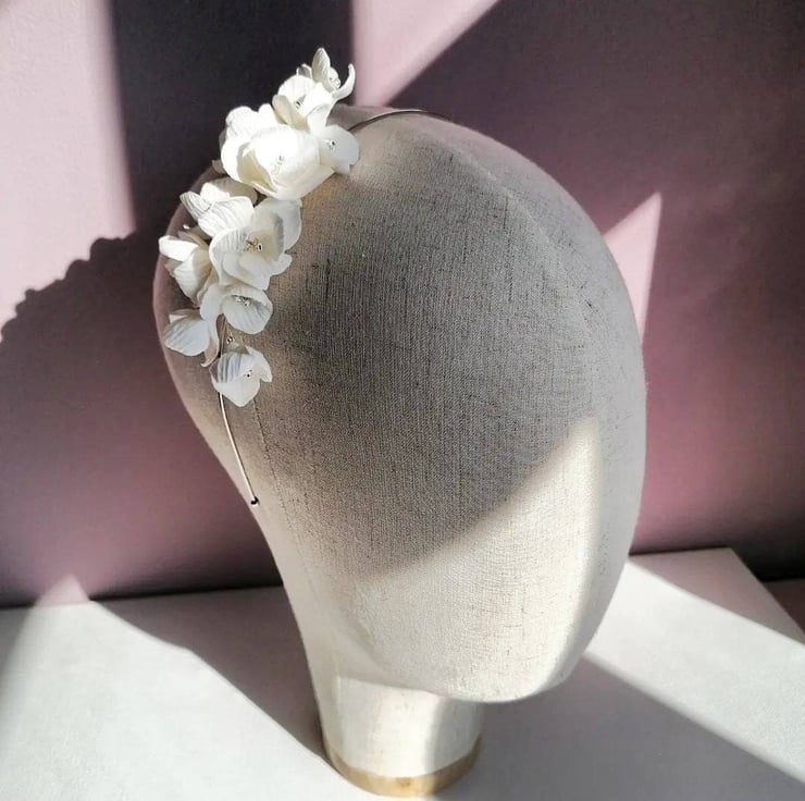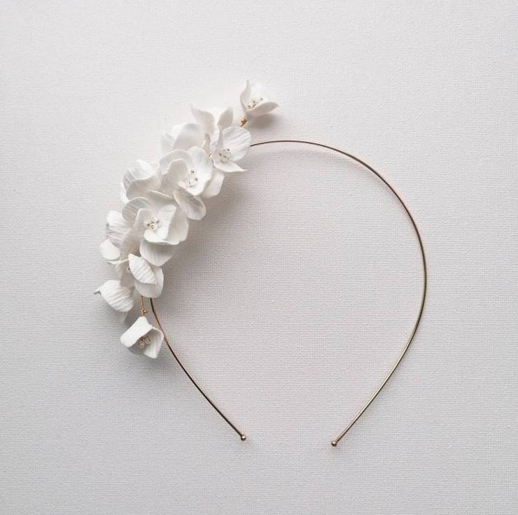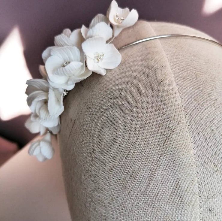 Emily's delicate white floral headband is made with intricately handcrafted flowers of durable clay. Each flower in its centre has silver-lined with clear seed beads.