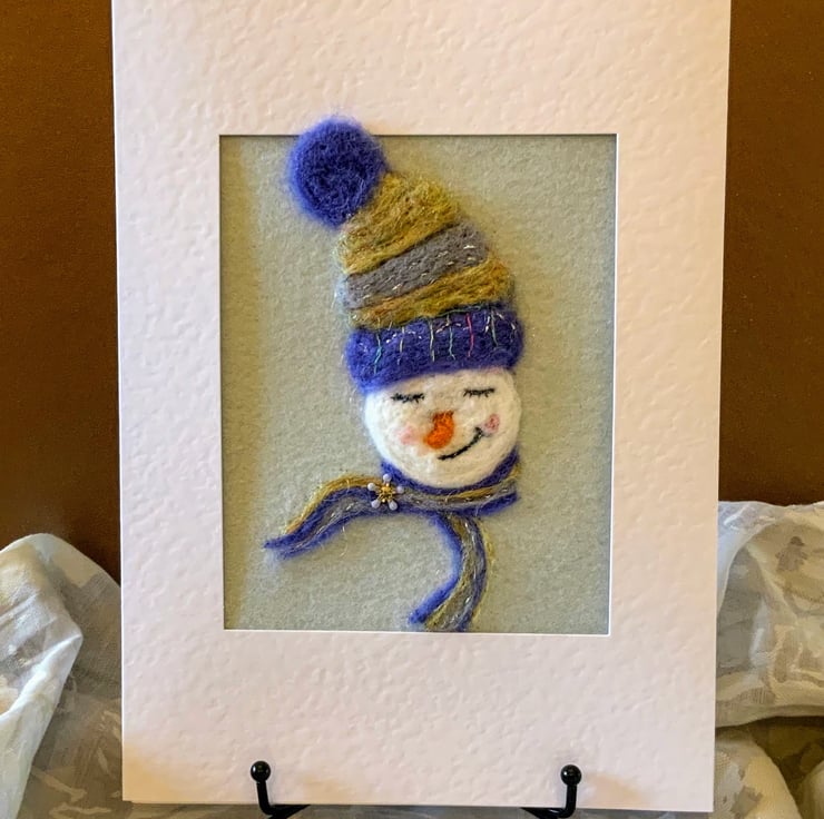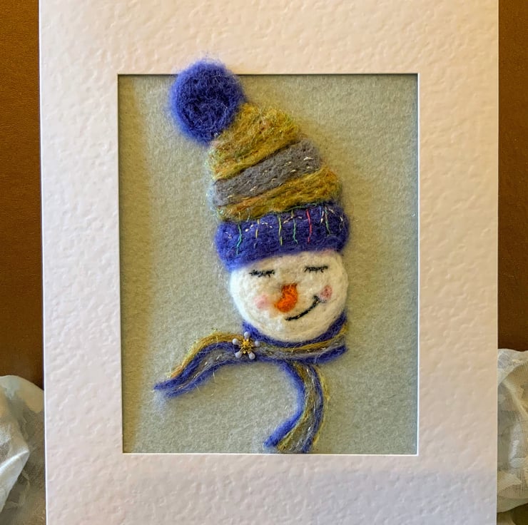 Needle felted snowman in wooly hat and scarf with snowflake brooch. Made from merino wool and free flow embroidery using silk threads