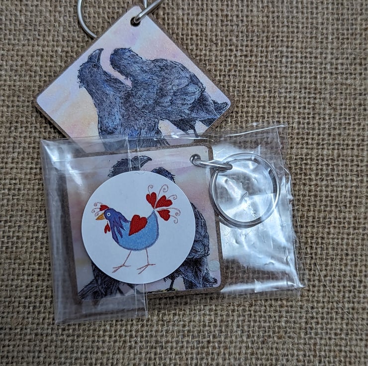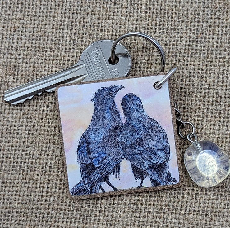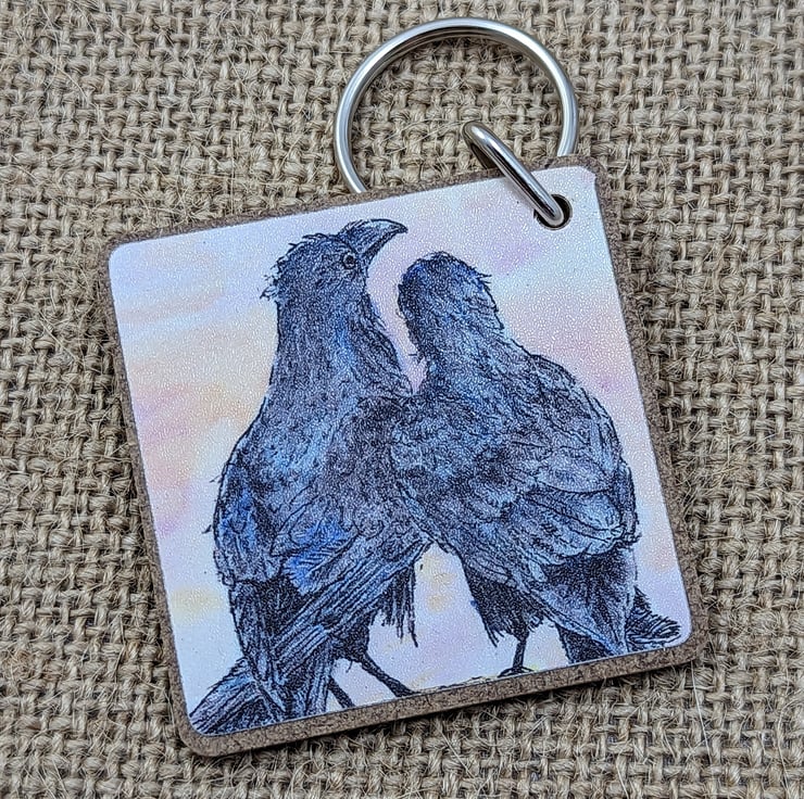 Keyring using my original illustration of two crows. Keyring is made from sustainably sourced MDF, and the design is on both sides. It measures 5 x 5cm square and the split ring measures 25mm