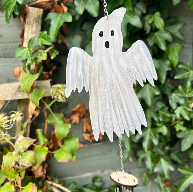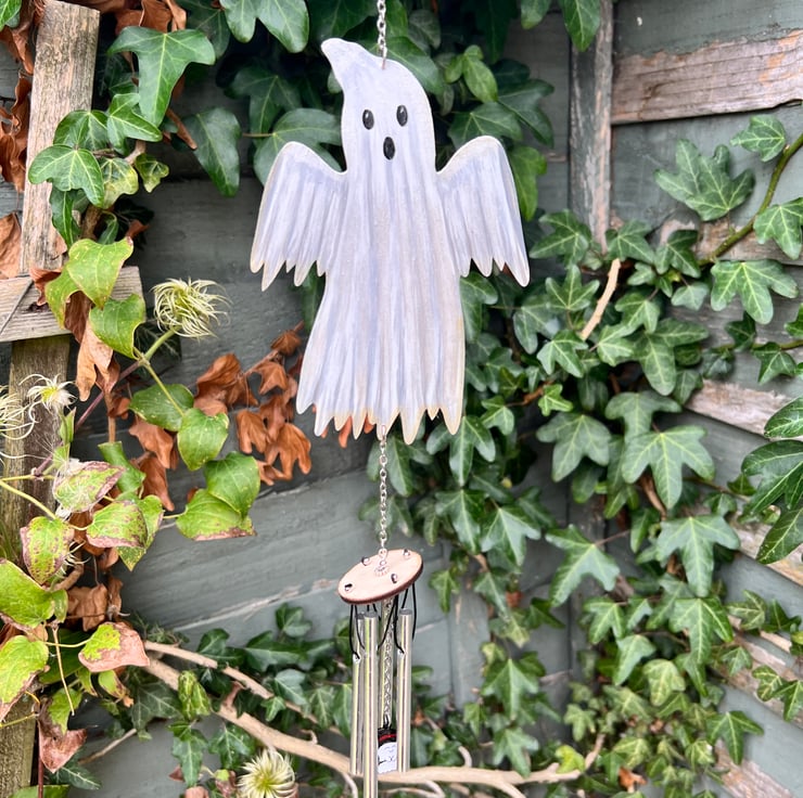 Halloween Ghost wind chime, original art, hand painted with acrylic painted with acylic paint and lacquered so it is suitable for outdoor and indoor use. A lovely addition to your Halloween decorations. Stainless Steel hanging chain and aluminum chime for a gentle sound.