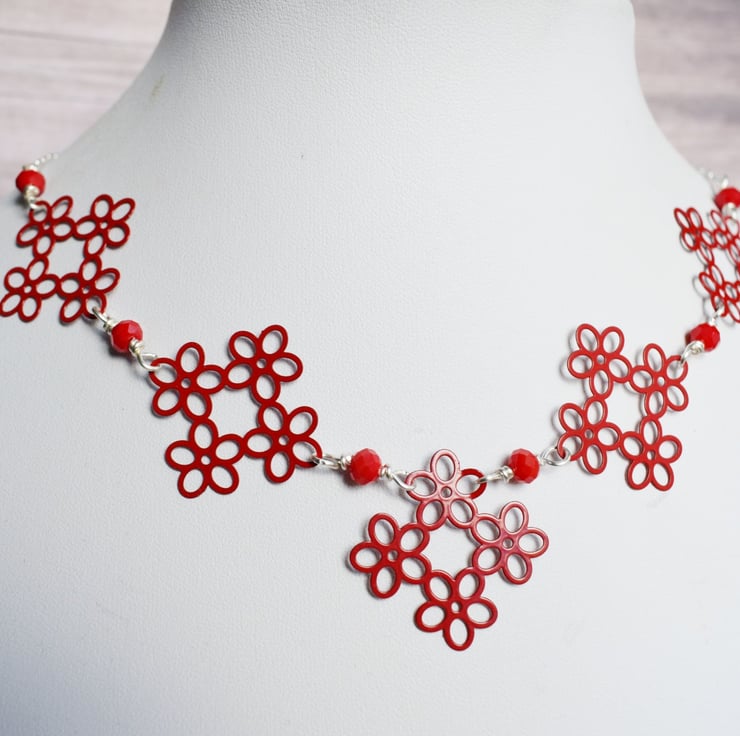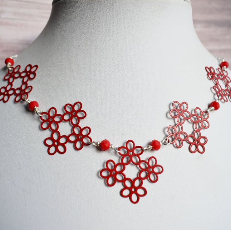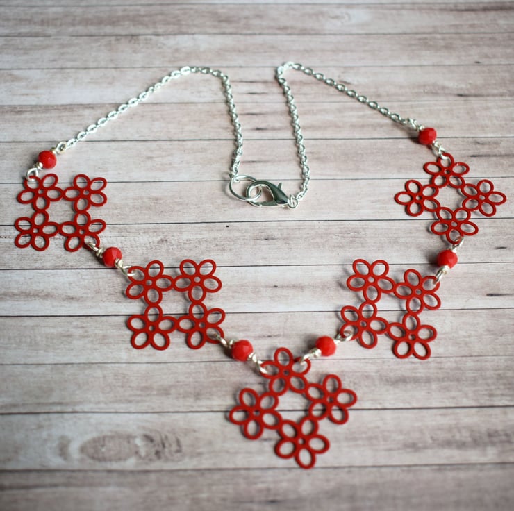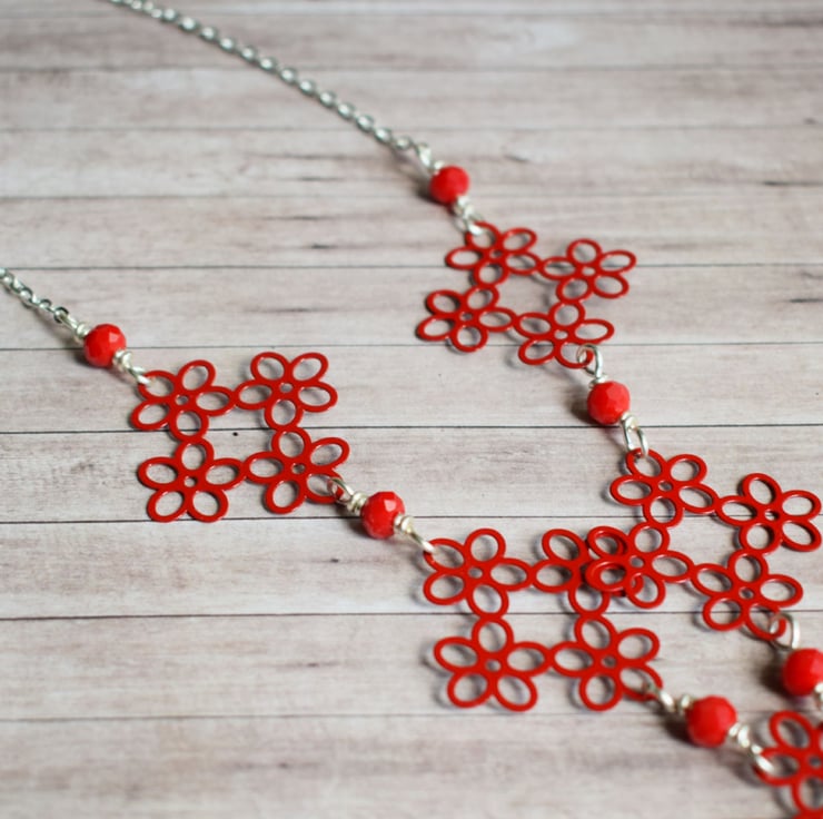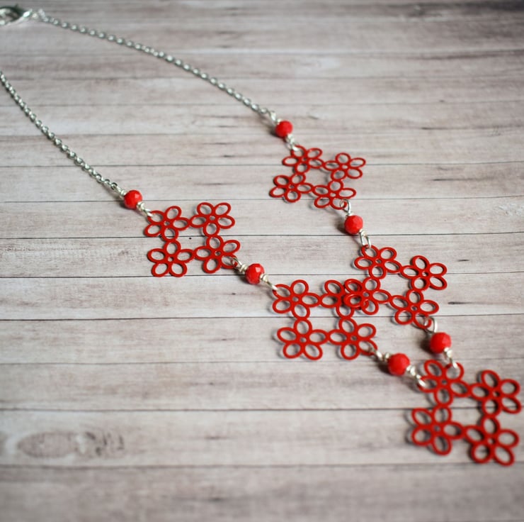 Beautifully bold but still quite delicate looking this red flower link necklace is a great way to add a pop of pillar box red to your outfit!