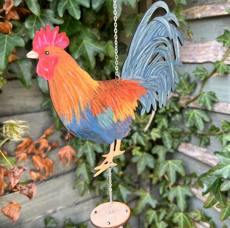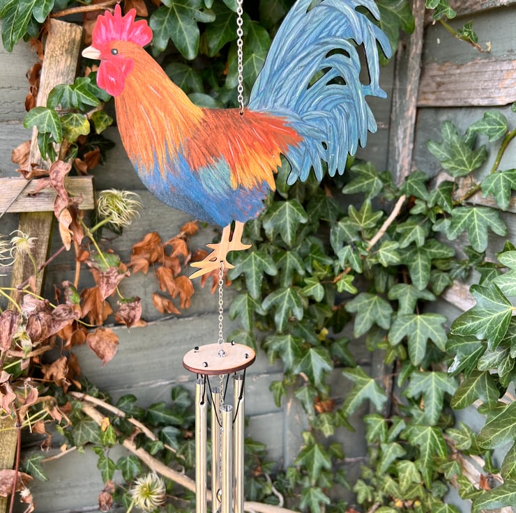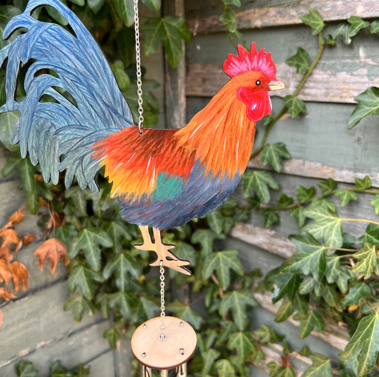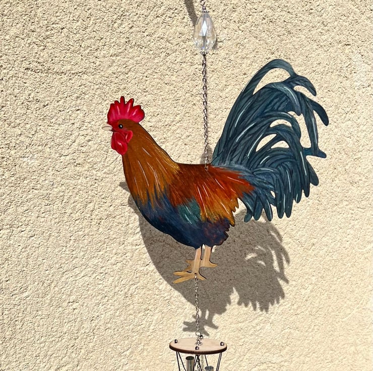 Original art hand painted cockerel wind chime. Painted in acrylic paint and acrylic shimmer paint the colours are absolutely stunning. Stainless steel hanging chain and aluminum chimes for a gentle sound. Suitable for outdoor and indoor use. A beautiful addition for any home or garden