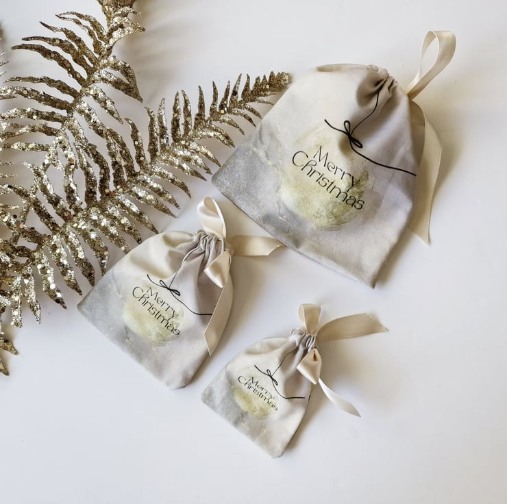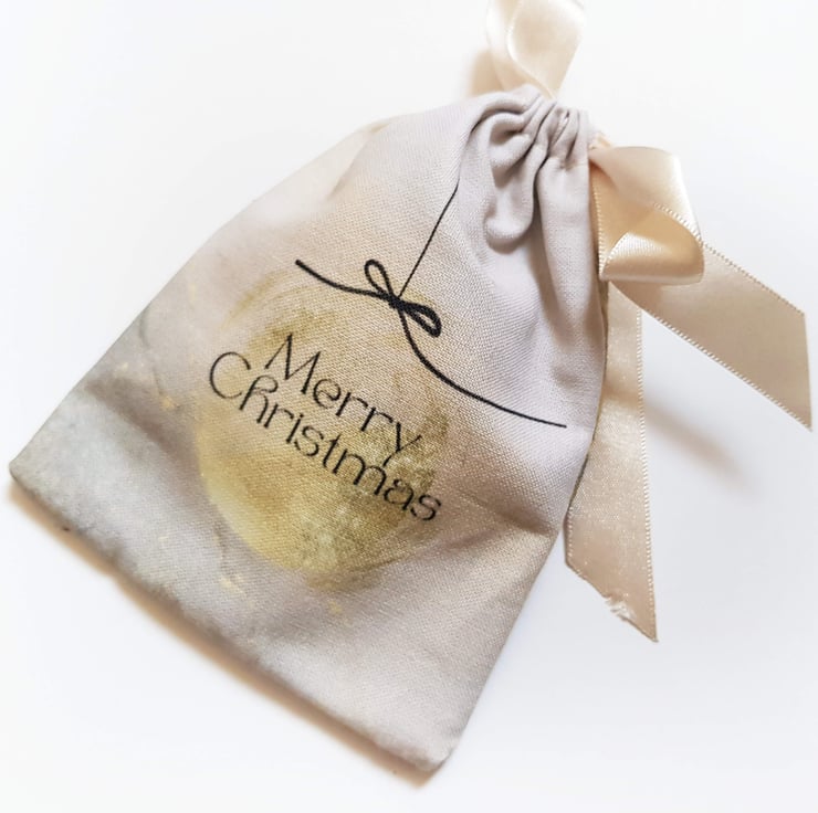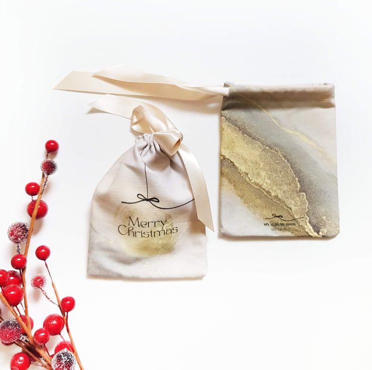 - Digitally printed design of a beige and gold marble effect with painterly gold bauble and 'Merry Christmas' text.