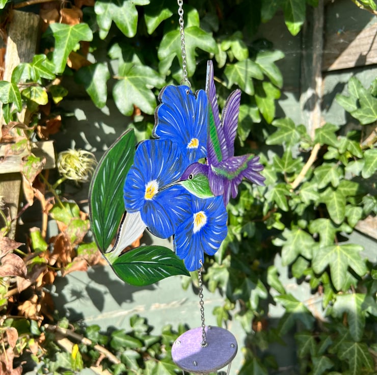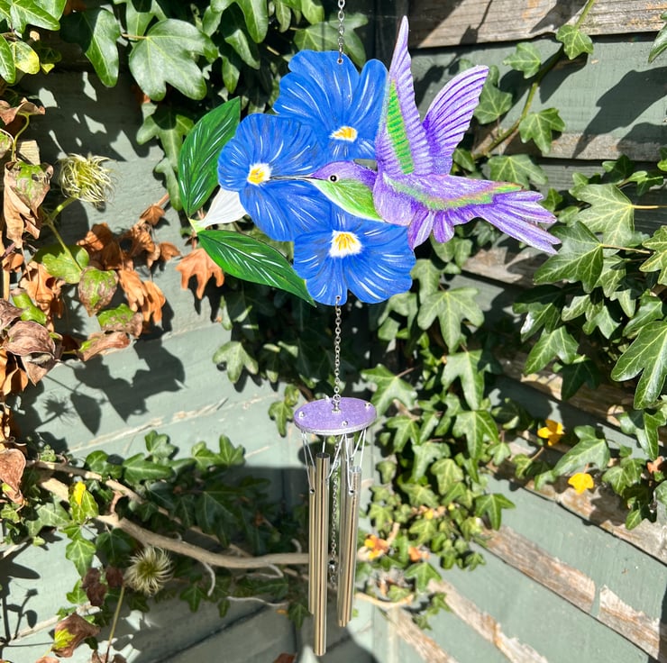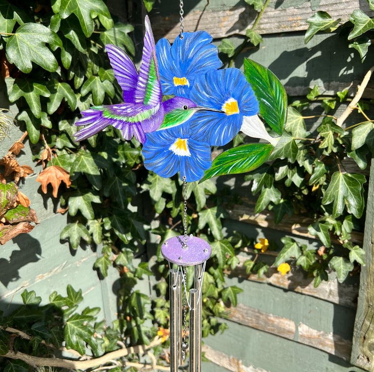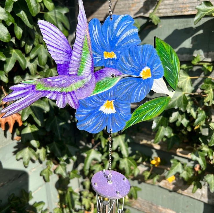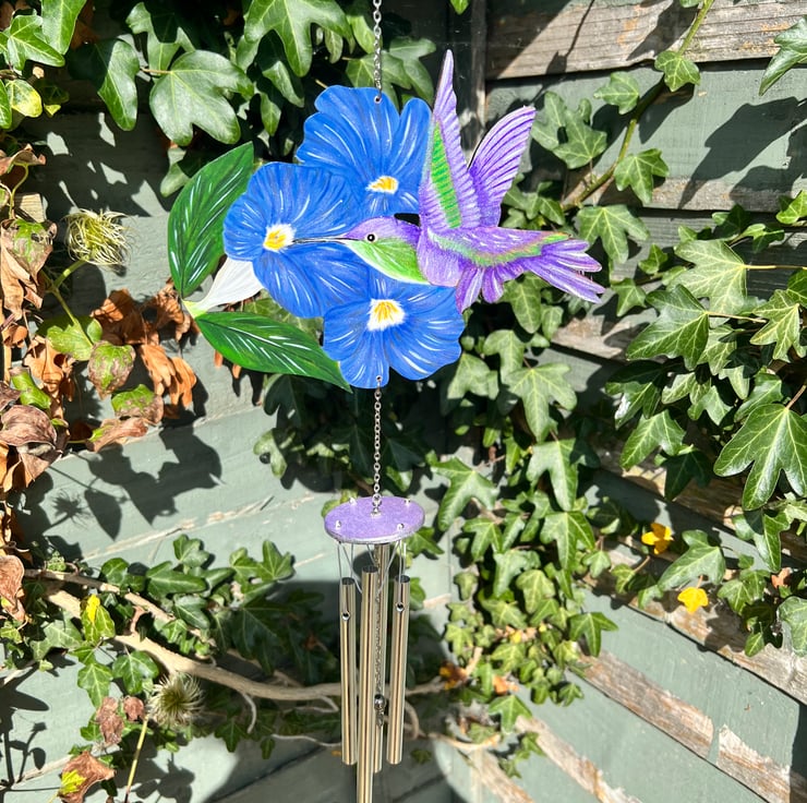Beautiful Humming bird wind chime. Painted with acrylic shimmer paint this wind chime catches the light beautifully. Lacquered so it is suitable for indoor and outdoor use. Stainless steel hanging chain and aluminum chimes for a gentle sound. A beautiful addition to any home or garden.