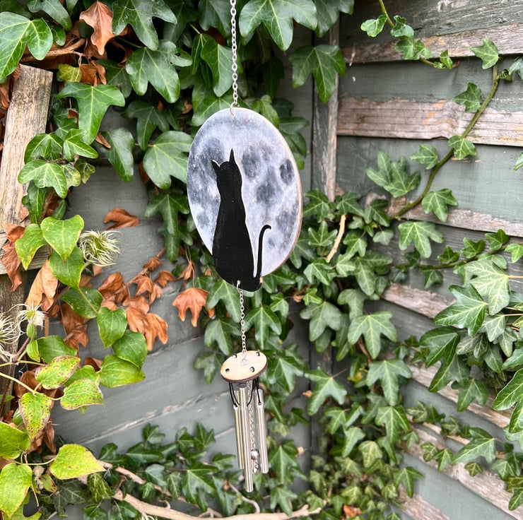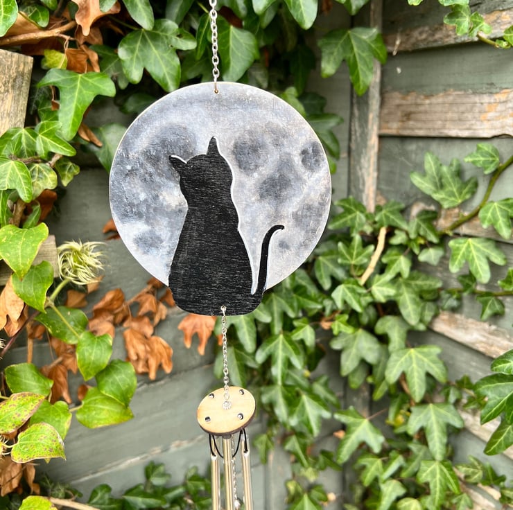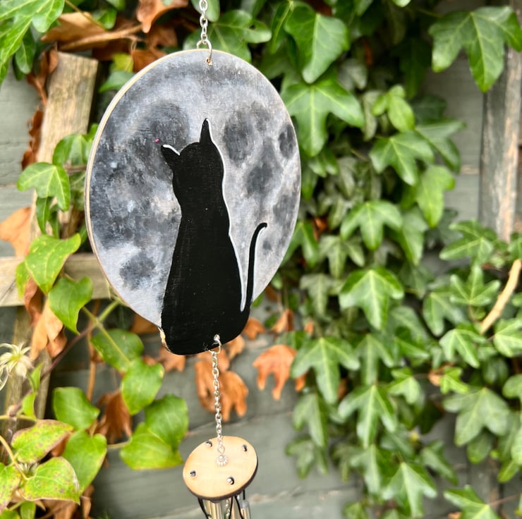 Original art hand painted cat and moon wind chime. Painted with acrylic paint and lacquered so it is suitable for outdoor or indoor use. A lovely addition to any home or garden. A great gift for any cat lover. Stainless steel hanging chain and aluminum chimes for a gentle sound