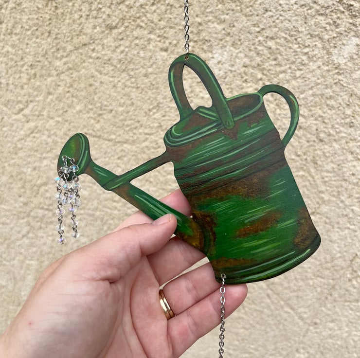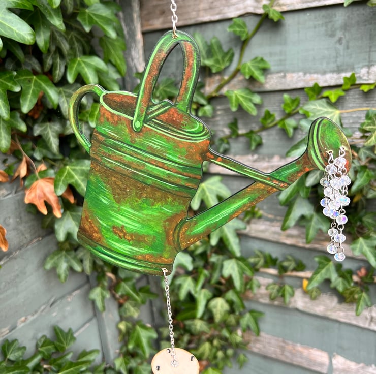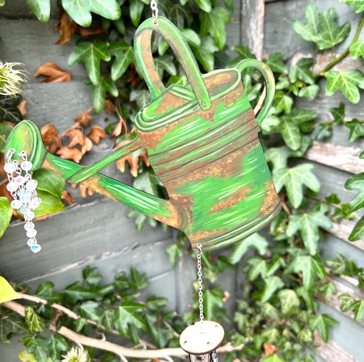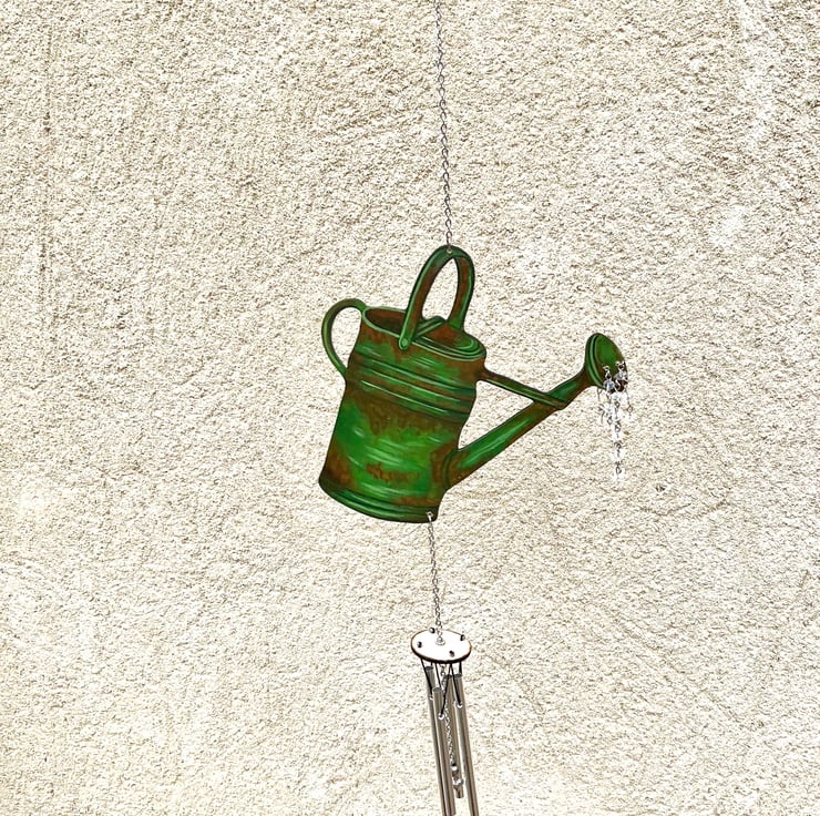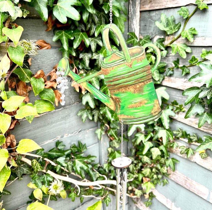 Original art and hand painted watering can wind chime. Painted with acrylic paint and lacquered so it is suitable for indoor and outdoor use it also has beautiful glass rainbow luster beads attached to the spout which catch the light beautifully m. A lovely addition to any home and garden and a lovely gift for a keen gardener. Stainless steel hanging chain and aluminum chimes for a gentle sound