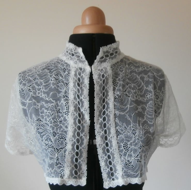 This lace handmade wedding jacket is made from English lace. It is hand sewn with French seams. Made from 80% Nylon 20% Viscose. A delicate, lightweight lace.