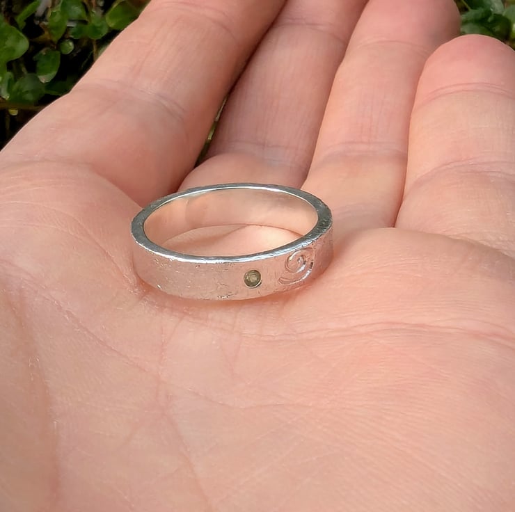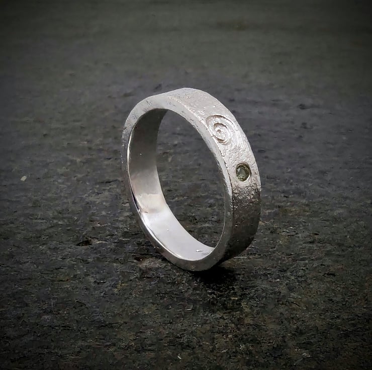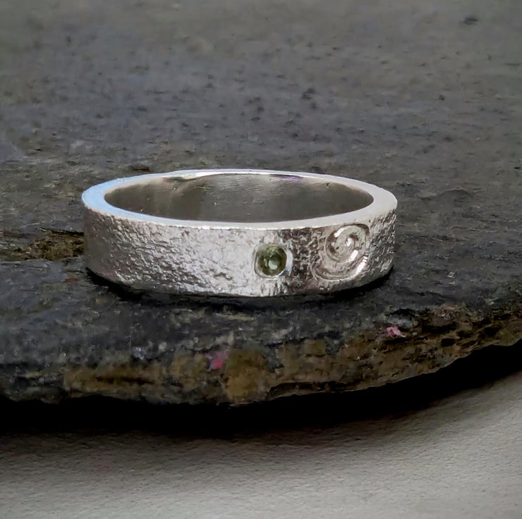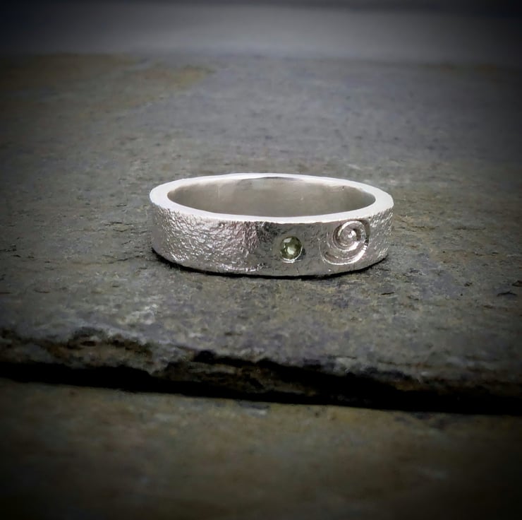 Heat fired textured ring with a spiral design and set with a little 2 mm peridot.