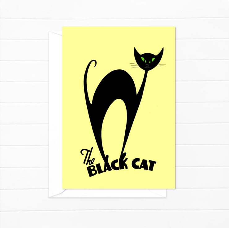 A mid century style atomic black cat on a yellow background. The card is printed as an any occasion greeting card but is ideally suited as a good luck card.