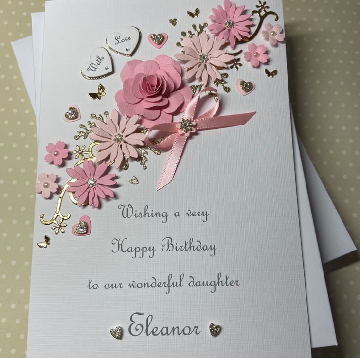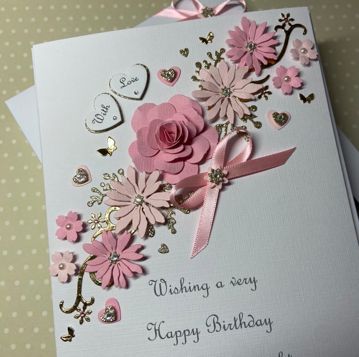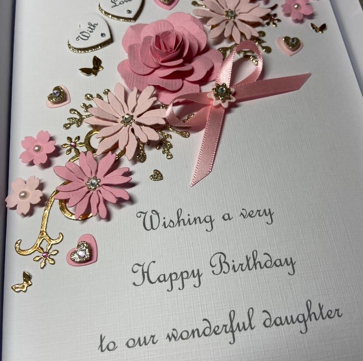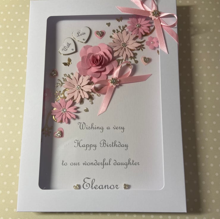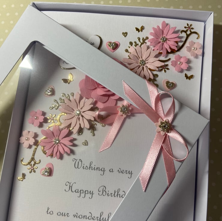 This handmade gift boxed card is A5 in size (210mm x 150mm) and can be personalised for any special occasion. It is on 300gsm cardstock and decorated with ribbons and gems. It comes in the matching decorated box and makes a wonderful keepsake.
