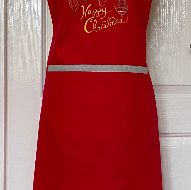 Embroidery reads 'Happy Christmas' and the apron measures approx 83 cm from top of bib to hem, 70 cm wide.