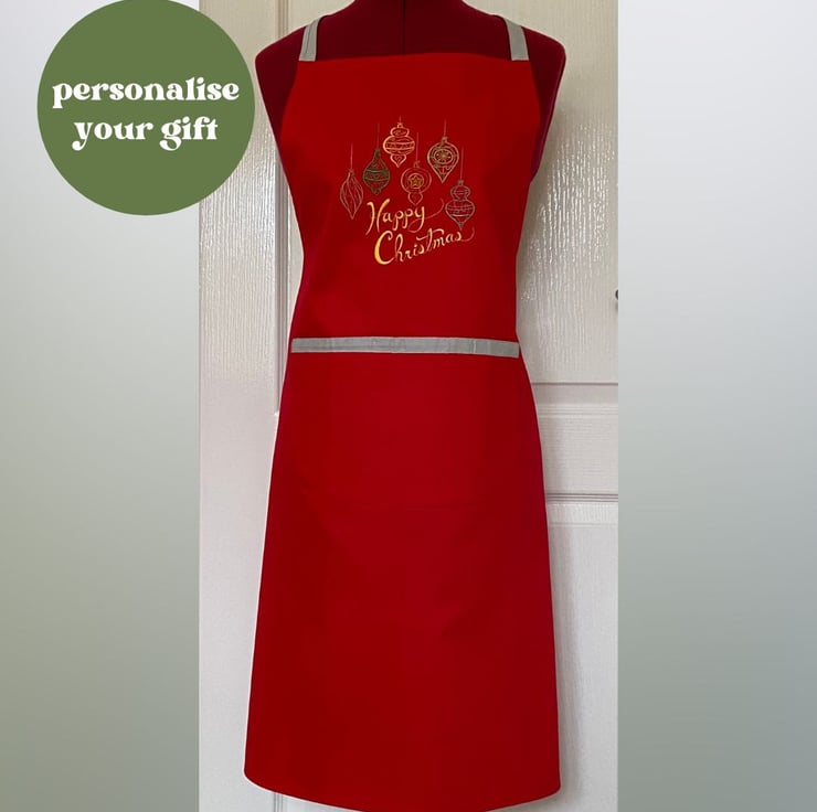 CHEF Style' APRON EMBROIDERED on the bib with Design 'Happy Christmas' and colourful baubles.